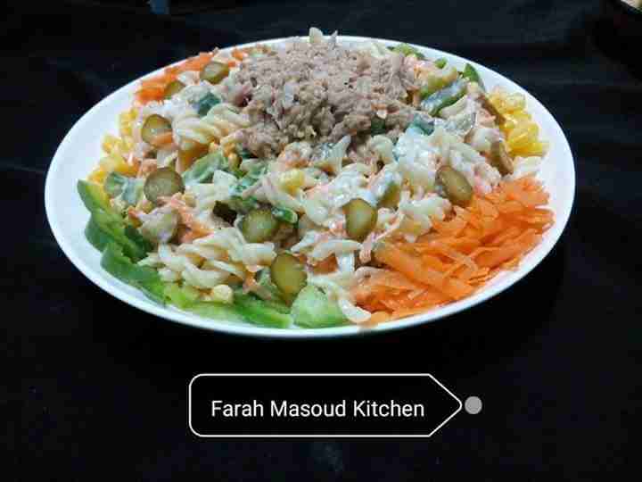 تخلط مكونات الدريسنج وتضاف على المعكرونة وتحرك ثم يضاف الخضار
