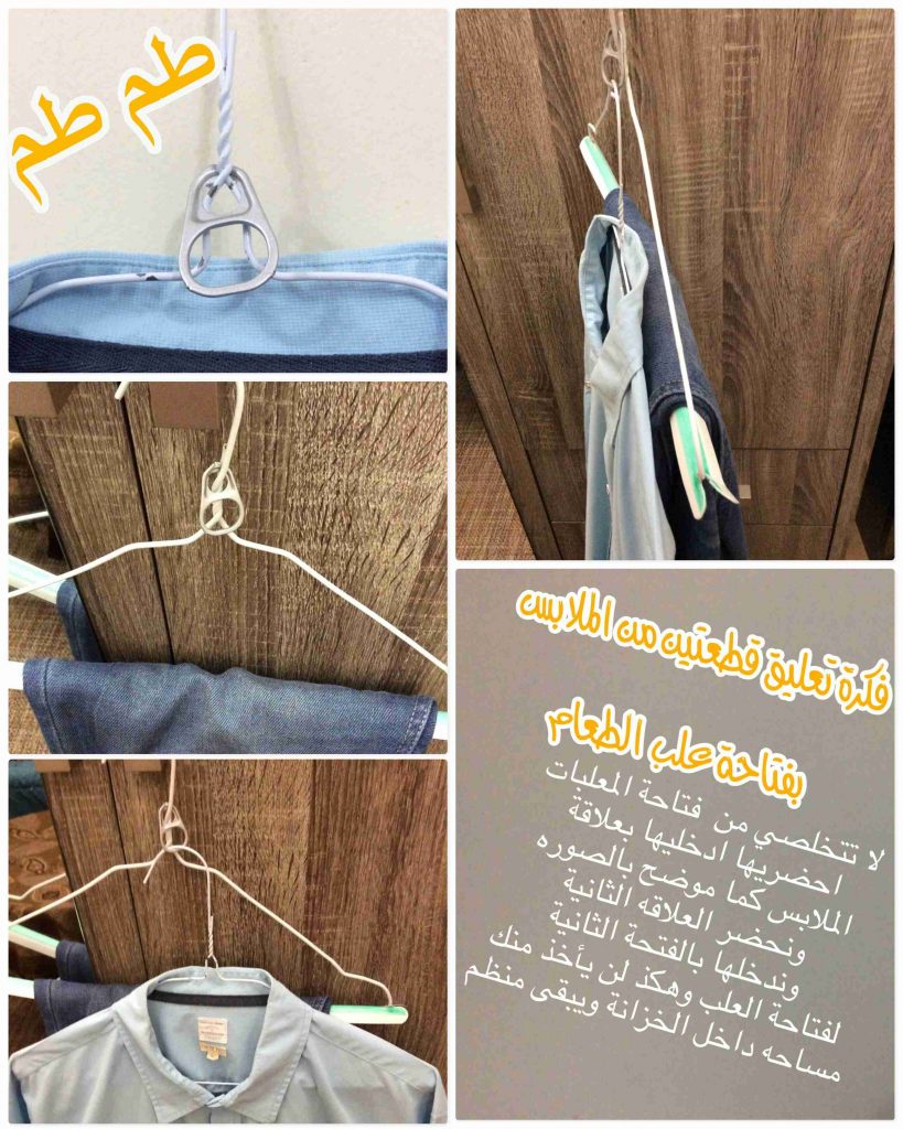 فكرة تعليق قطعتين من الملابس بفتاحة علب الطعام.