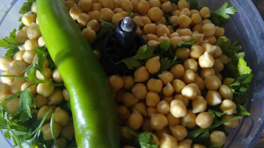 اول اشي بنصفي الحمص من المي وبنطحنو على الخلاط مع البصل والبقدونس والثوم والفلفل الحار وبعد طحنهم