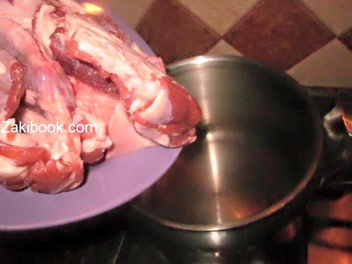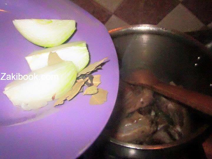 قليت اللحمة اول شي بدون زيت لانه فيها دهن نزلت أدام منها وفيها
