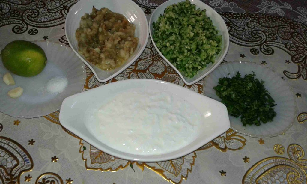 بداية بقوم بشوي حبة الباذنجان بالطريقه المعتاده وبقوم بتنظيفها جيدا وتقطيها ناعمه جدا وبضيفها للخيار المقطع ناعم والزبادي طبعا بعد ما تبرد بضيفلها التوم المهروس وقليل من الملح