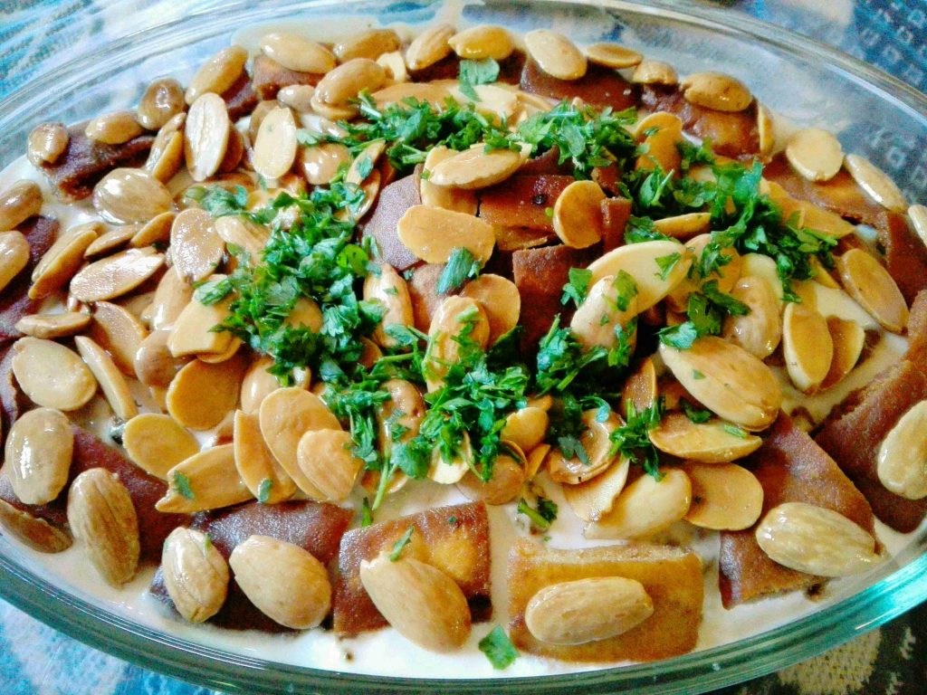 & وأخر شي بنزين صحن التقديم بالخبز المقلي واللوز ورشة بقدونس .