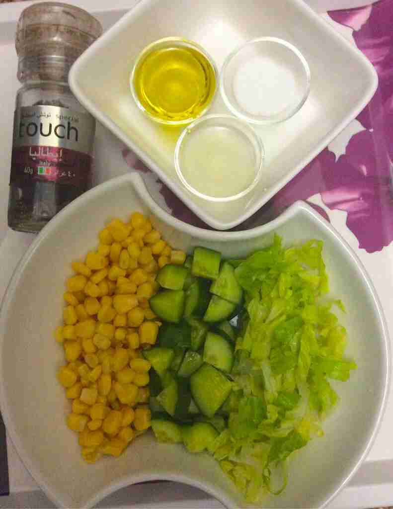 نقطع في الصحن خيار مكعبات صغيره وفوقها الخس ثم الذره ونرش الدرسينك هو عباره عن