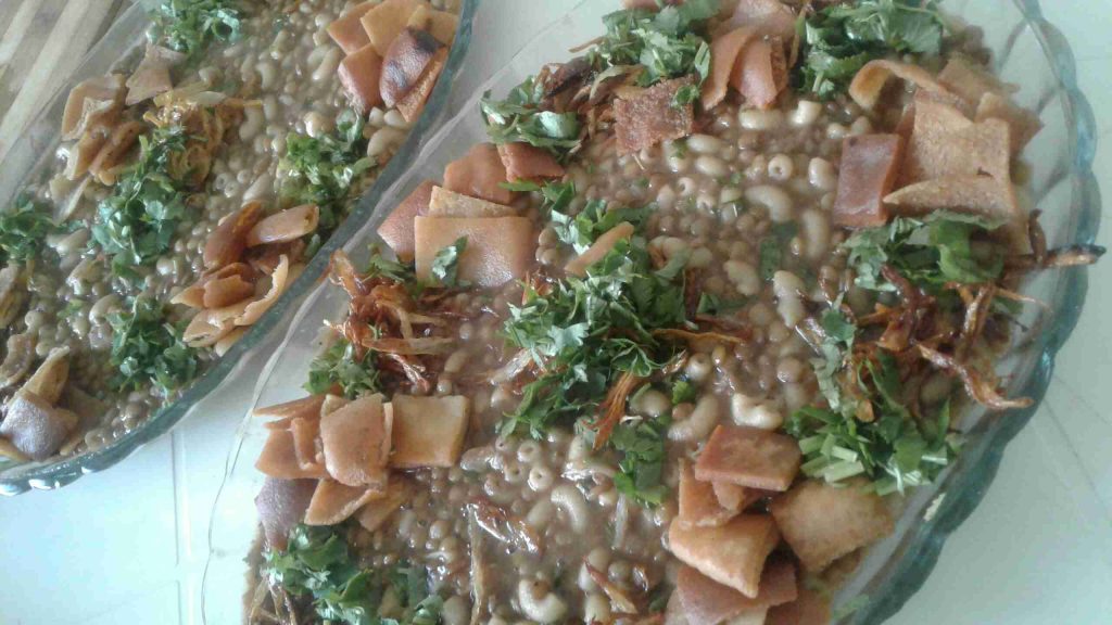 – بعد نضج المعكرونة نغرفها في طبق التقديم ، ونزينها بالكزبرة المفرومة والبصل والخبز .
