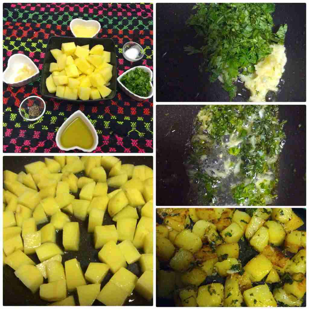 نضع الزيت بالمقلى ثم نضع البطاطا ونرش الملح ونغطيها حتى تستوي وتشقر قليلا بنفس المقلى على طرفه نضع الثوم والكزبره الخضره نقليهم حتى يذبلوا ثم نضع الليمون والفلفل الاسود ونخلطهم مع البطاطا لكن بتروي حتى لا تتفتفت البطاطا حتى يتجانسوا مع بعض فقط 3 دقائق ثم نزينها ونقدمها شهييييييييييه ولذييييييييذه جداااااااااا