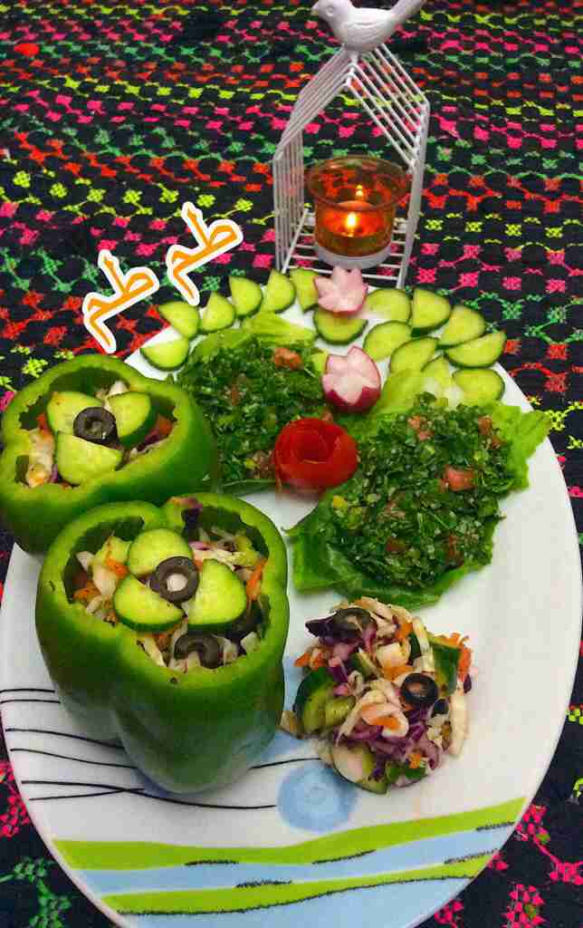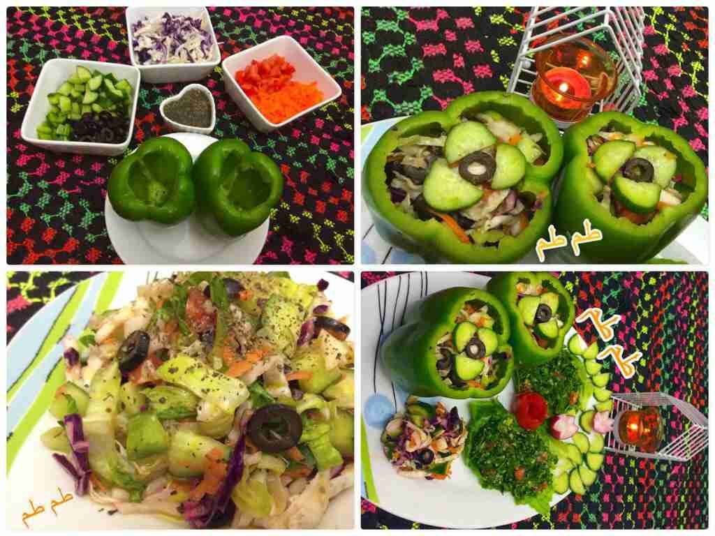 نخلط المكونات السابقه ثم نضع عليها خليط الدرسينك ونقدمها انا قدمتها داخل حبات الفليفله الخضراء لذييييذه جدا