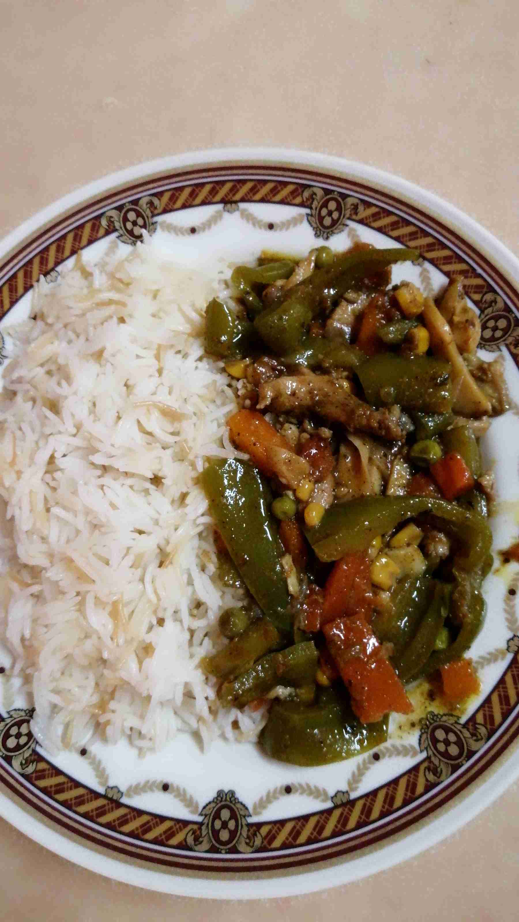 في طنجره على الغاز نضع الزيت ونضيف إليه البصل والثوم ونحركهم حتى يذبلو ثم نضيف إليه الدجاج ونقلبه قليلا ونتركه مده 5 دقائق ثم نضيف الفطر والجزر ونحرك المزيج جيدا ونتركه مده 10 دقائق بعد ذلك نضيف باقي الخضروات والملح والبهارات ونحرك المزيج جيدا مع اضافه كوب ماء ونتركه حتى الاستواء بعد ذلك نضيف 3 ملاعق كبيره صلصه الصويا نتركها مده 5 دقائق تسكب في طبق التقديم وبجنبها الأرز الأبيض وتزين بالمسرات حسب الرغبه