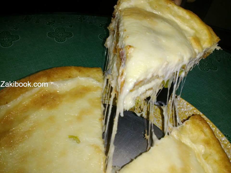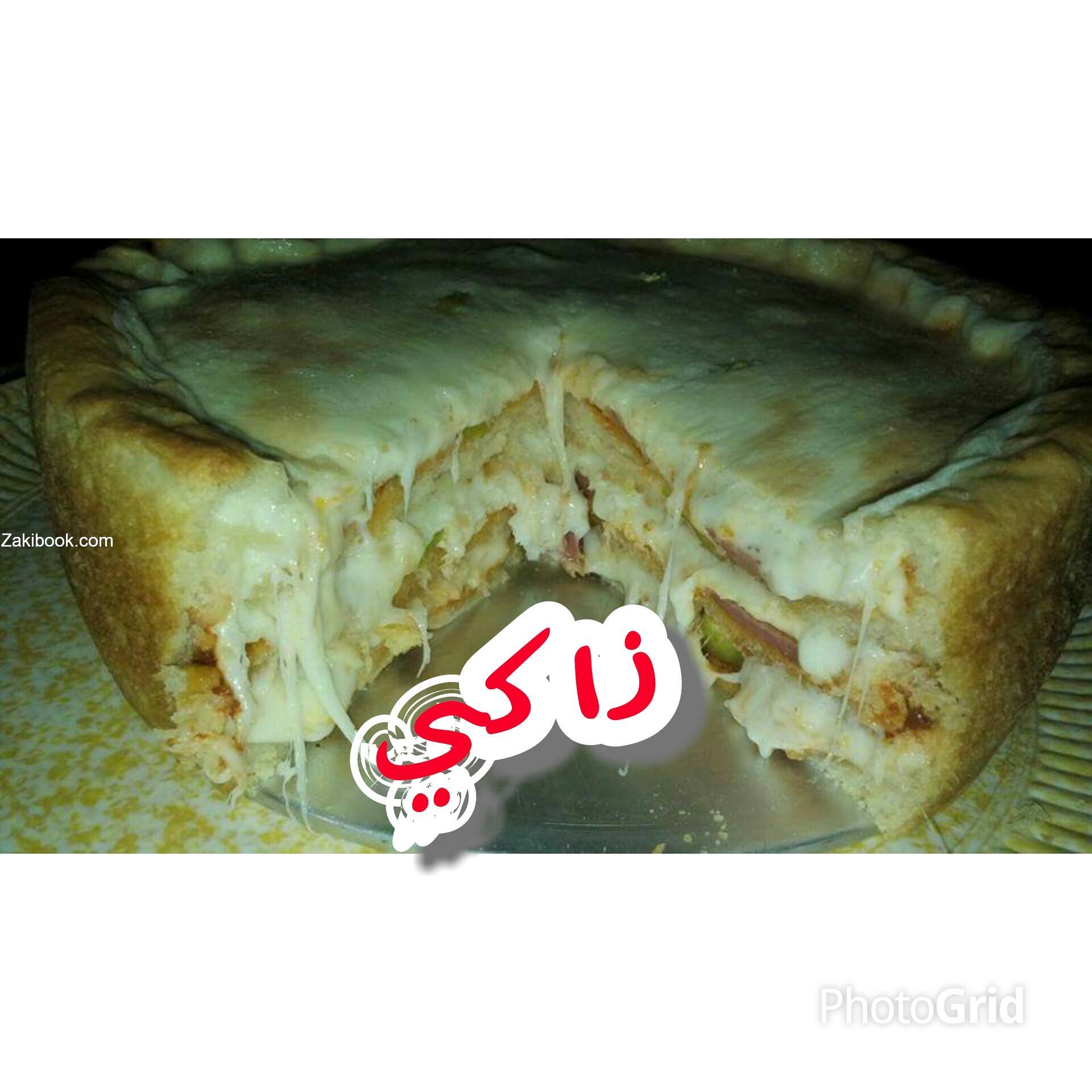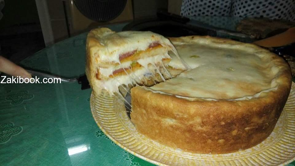 نعمل قاعدتين من العجين على مقاس قاعدة الصينية و ندخلهم الفرن حتى يستوي لأنهم سوف يبقى في داخل قالب أي في وسط طبقات الكيك ثم نحضر القالب ونقطع عجينة على حجم جوانب القالب ندهنه بالزيت. ..ثم نضع اول قاعدة من اللي قطعنا هم وخبزناهم في الفرن ونضع صلصة البيتزا والحشوة سواء أكانت :سويس أو بيروني أو لحمة مفرومة والفلفل الأخضر المقطع والجبن الرومي المبشور وموزريلا ثم نضع القاعدة الثانية ونحشو كما في السابق هكذا حتى تنتهي الطبقات لحين أن نصل لنهاية ارتفاع القالب …الطبقة الأخيرة جبنة .. وندخلها الفرن حتى تتحمر