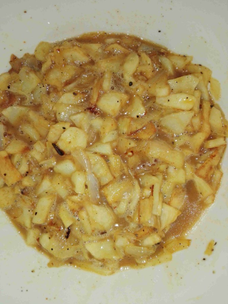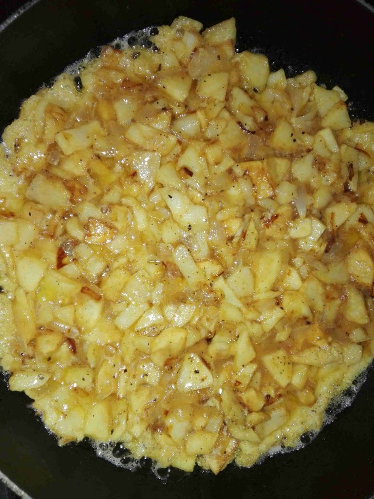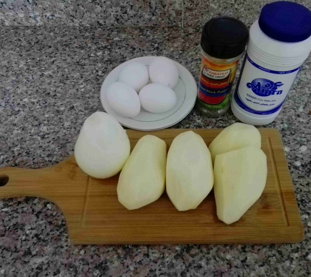 & بجهز البيض بجاط وبضع عليه ملح وفلفل أسود وبخفقه ..وبعدين بضيف عليه البطاطا والبصل وبحركهم كويس واذا لاحظت في قطع بطاطا كبيره بصغرها بالمعلقه .