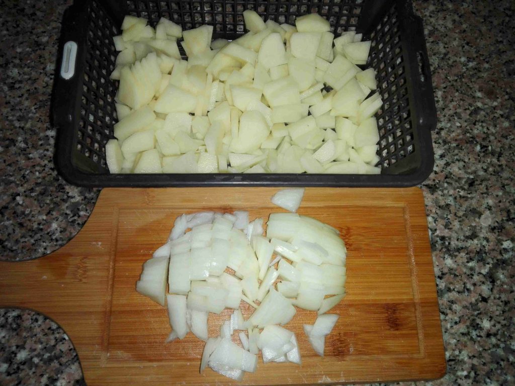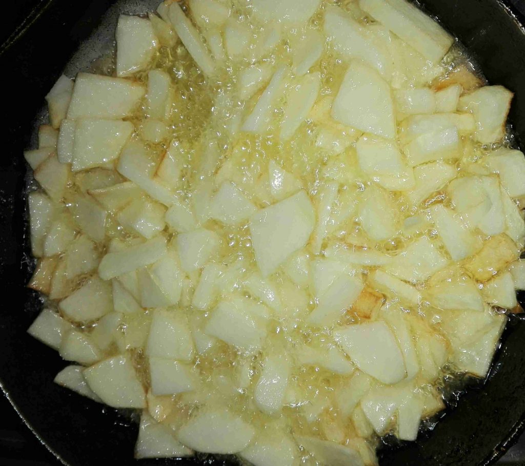 & اول شي بنقشر البطاطا وبنقطعها شرائح صغيره وبنقليها ..
