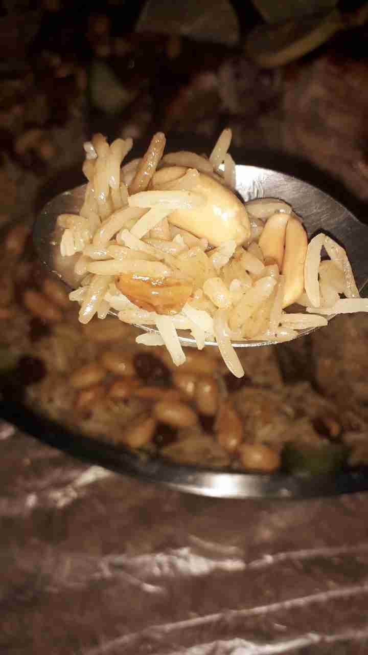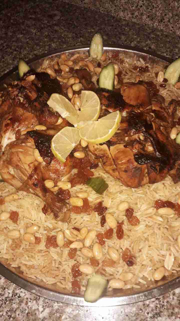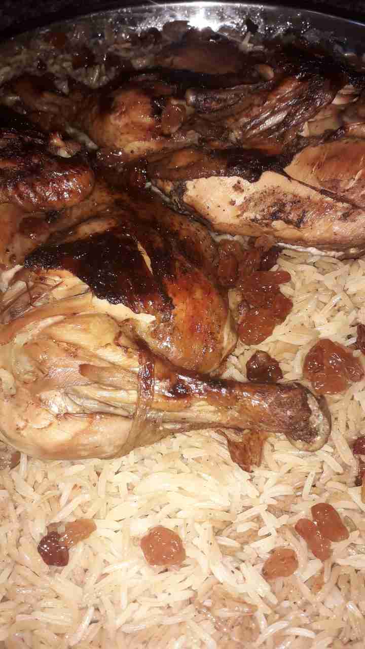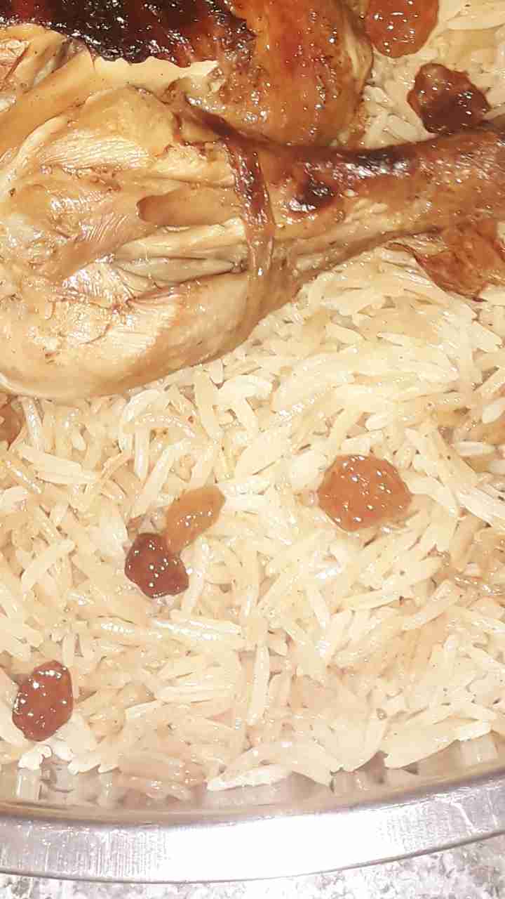 بحط المي المصفية من الخضار والبهارات بطنجرة مناسبة لكمية الرز وبحط معها نص كمية الزبيب المحمص والمنقوق بماء الزهر وبس تغلي المي بحط الرز فوقها مع ملعقة زيت ذرة بخليها نتفة ع نار عالية وبعدها بخفف النار وبغطي الطنجرة من عشر دقايق لربع ساعة حتى يستوي الرز منيح ويتفلفل بطفي النار تحتو، بتركو ربع ساعة بعد الاستواء وبعدها بقدمه مع الدجاج المحمر وبزينو بباقي كمية الزبيب المحمص وفستق او لوز مثل مابتحبو والف صحة وهنا ، ان شاء الله هالوصفة تنال اعجابكم❤