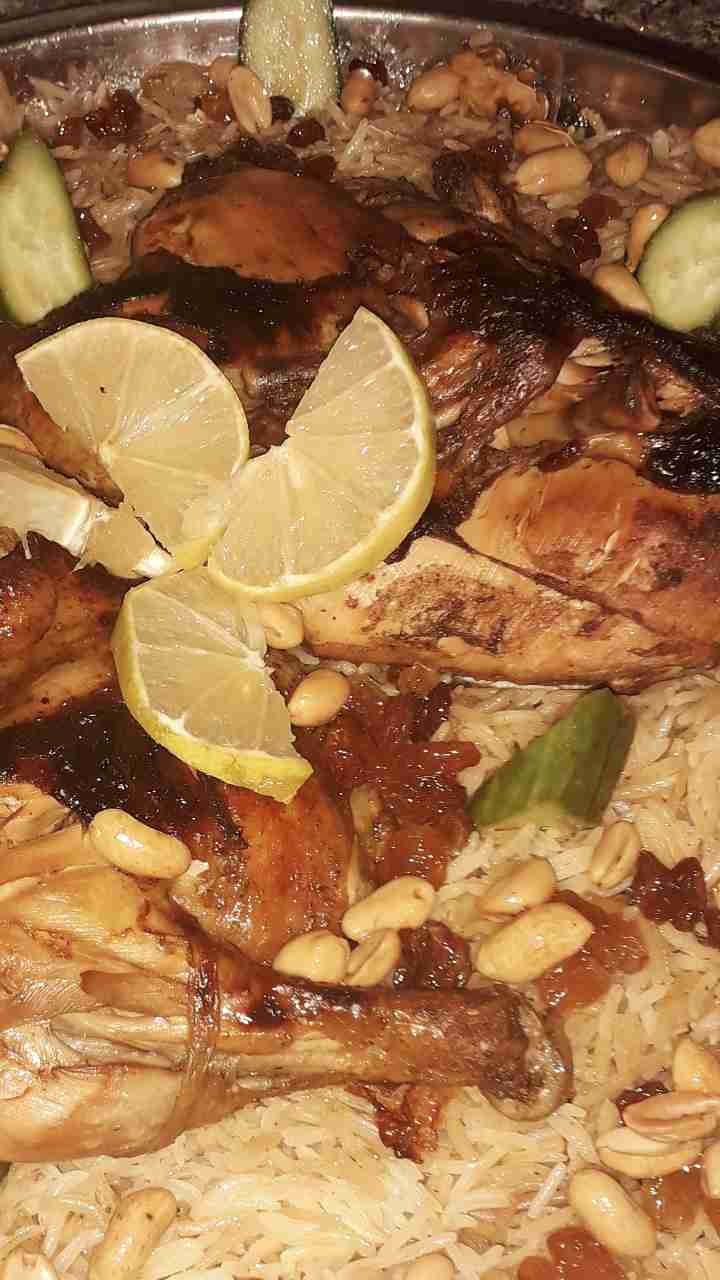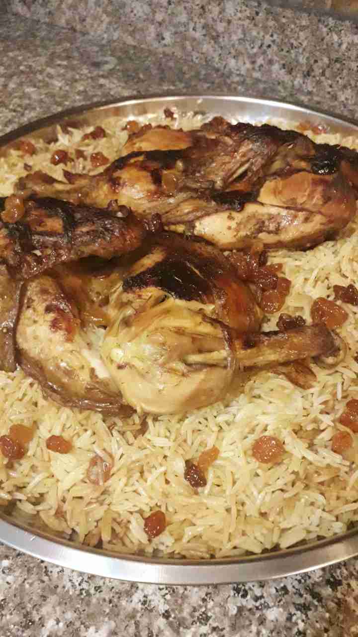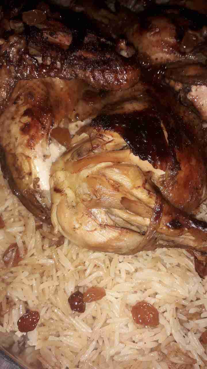 بس تستوي الجاجة بدهن صينية وبحط الجاجة فيها وبدهن الجاجة بزيت ذرة او زبدة مثل مابتحبي وبحمرها بالفرن من فوق، الزبيت بحمصه بشوية زيت ذرة مارح يوخذ معي ثواني بزيت حامي وبشيله بصحن وبحط ملعقتين ماء الزهر فوق الزبيب المحمص وبتركو ع جنب