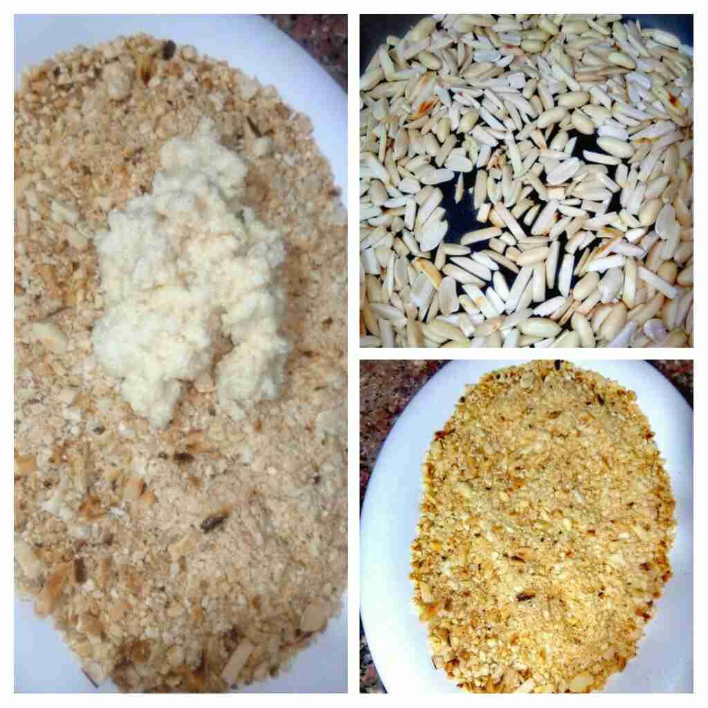 نحمص اللوز والفول السوداني على نار هادئة ثم نطحنهم طحن خشن ونضيف لهم ملعقتين من العجينة. هالحركة بتنعمل لتزيد سماكة الحشوة شوي.
