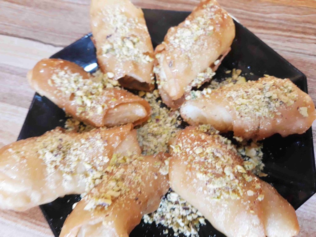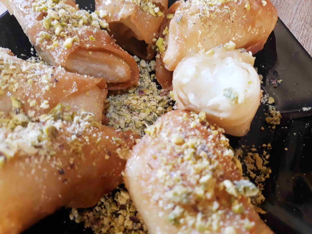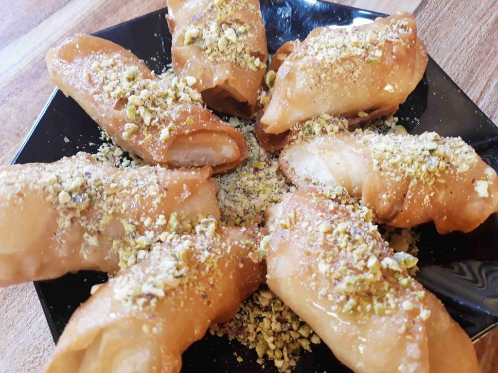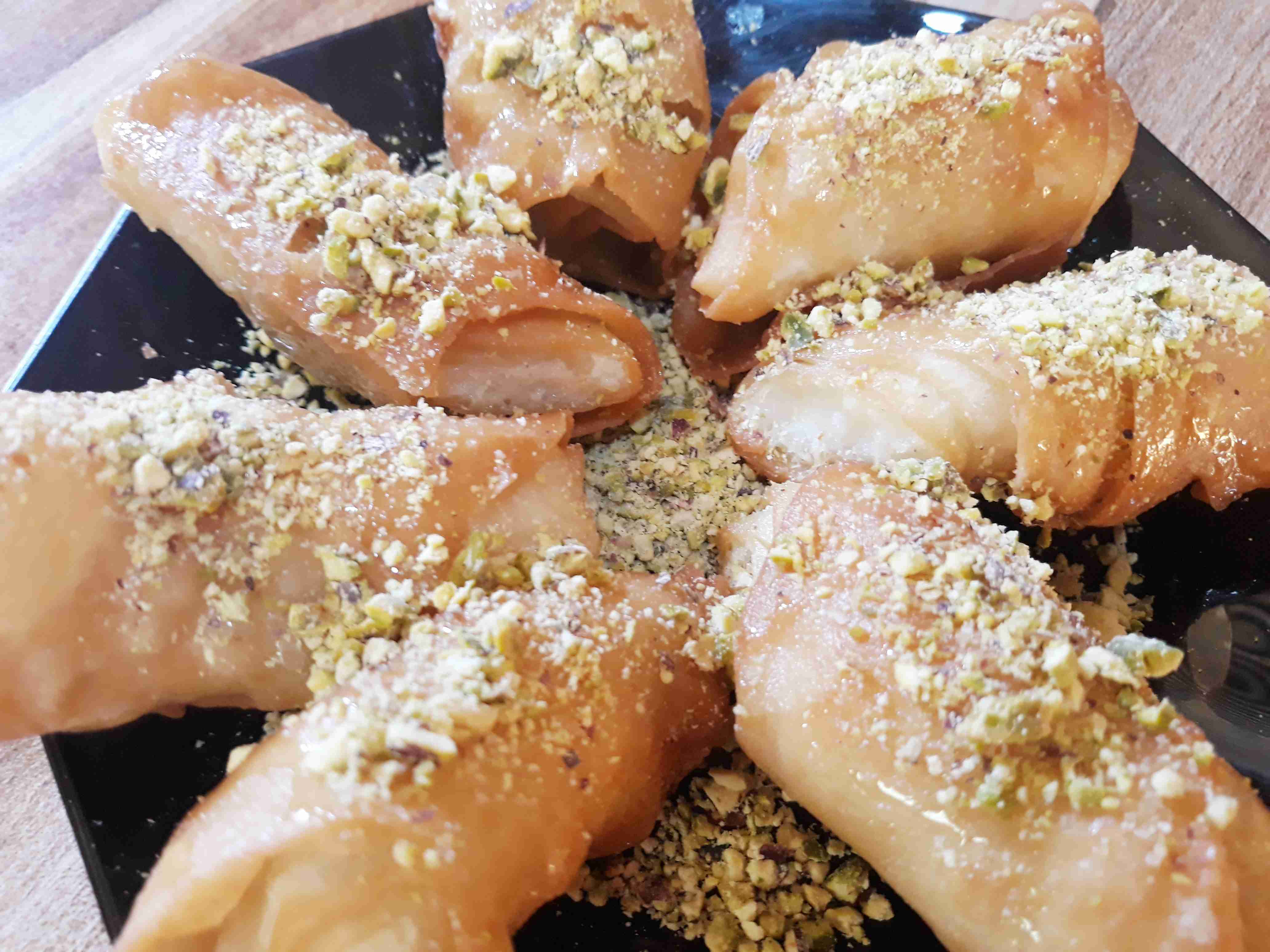 نفرد عجينه الفيلو او الكلاج ونضع الحشوه بالوسط ونلفها رول ونقليها بزيت غزير لما يسير لونها ذهبي بنطلعها وبندهنها بالقطر وبنزينها بالفستق الحلبي وتقدم والف صحه
