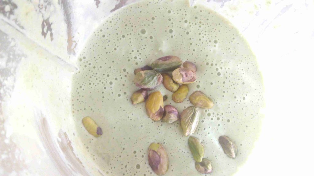 نضع جميع المقادير بالخلاط ما عدا الفستق ونخلط لغايه امتزاج الخليط مع بعضو وبعد هيك بنضيف الفستق الحلبي وبنستمر بالخلط لما ينطحن الفستق ويتجانس الخليط منيح يقدم والف صحه وهناا