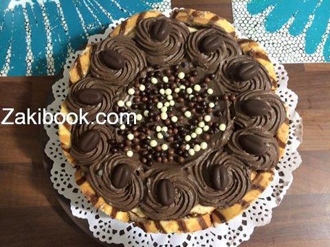 عملت اول طبقة كريمة و رصيت قطع الكيك و حطيت على الكريمة ملعقة كبيرة كاكاو و خلطة كويس و حطيتة فوق طبقة الكيك و بعدين حطيت كيك و ضفت على الكريمة ملعقة الى ملعقتين كاكاو بحيث اللون يصير اغمق هو الي زينت بيه من فوق و تدخل على التلاجة و لازم تبرد كويس قبل ما تشيلي الايطار