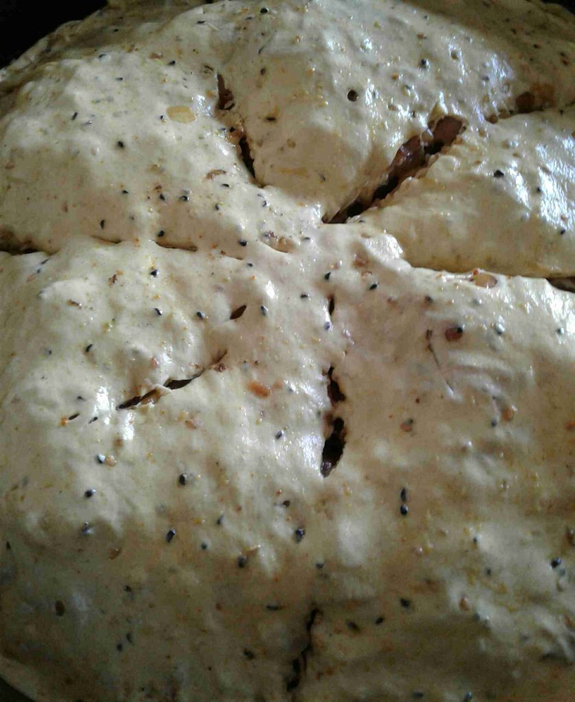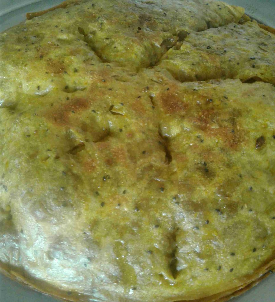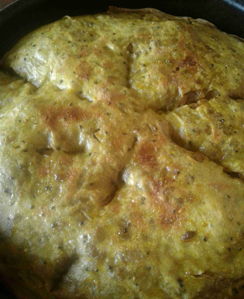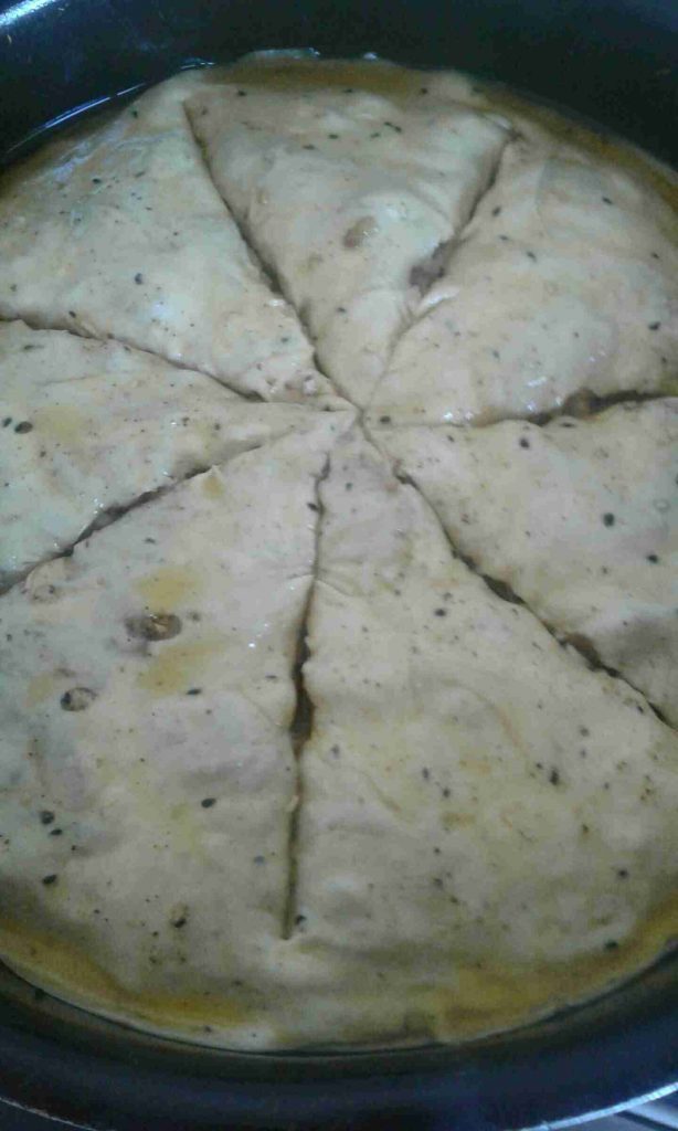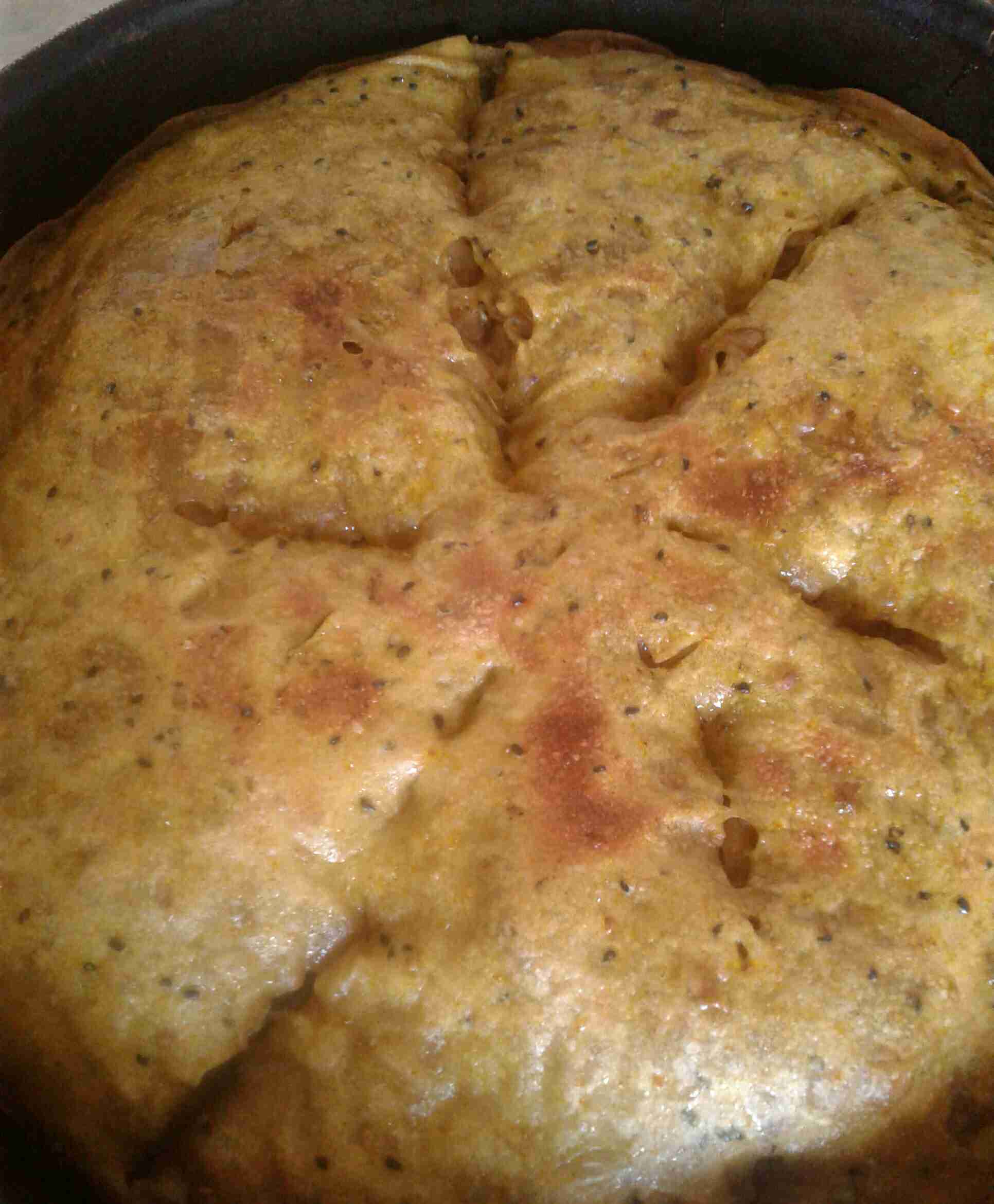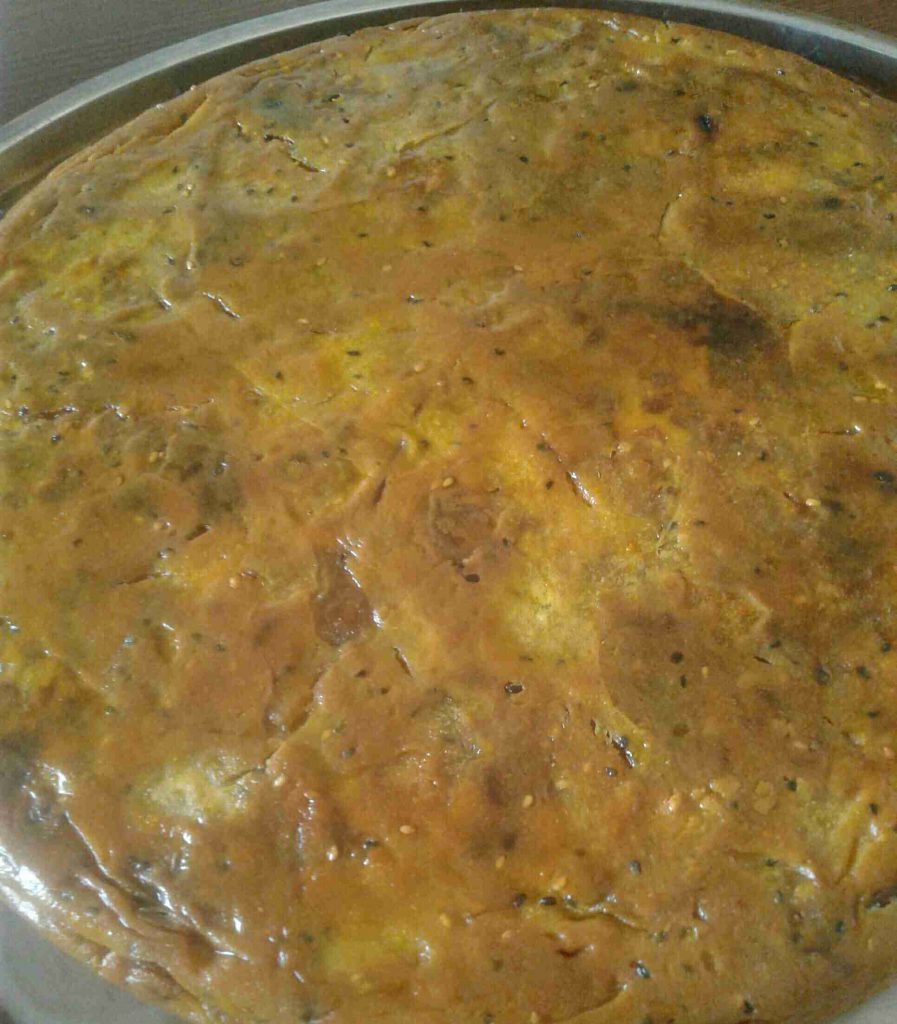 – بعد التأكد من نضج العجين ندهن سطحها بالزيت المصفى من البصل ونحمرها .