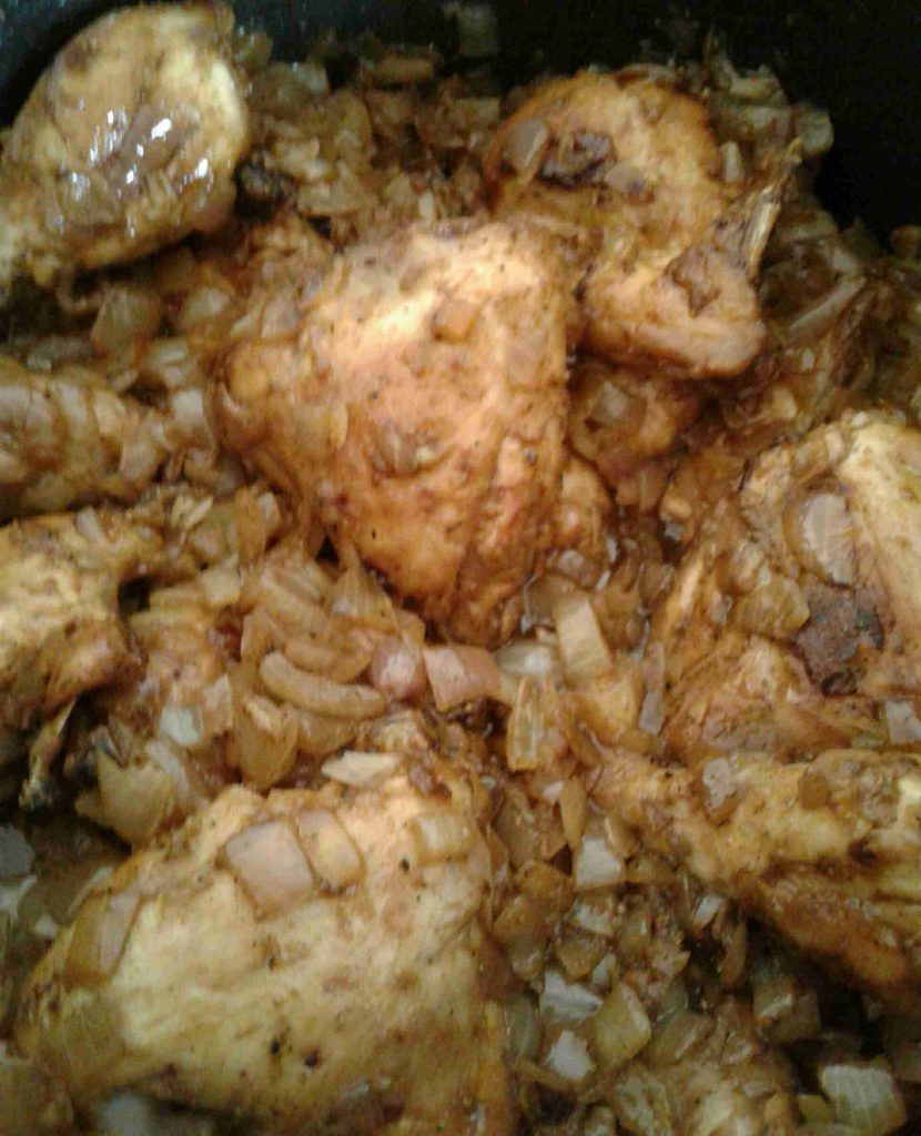 – نقطع الدجاج (كل دجاجة ٨ قطع) ونقليه في زيت غزير على حرارة عالية (نص استوا) حتى يأخذ اللون الجميل ، ثم نضيفه للبصل ، ونقلب المكونات مع بعضها ، ونتركها تبرد .