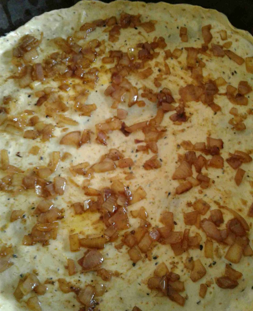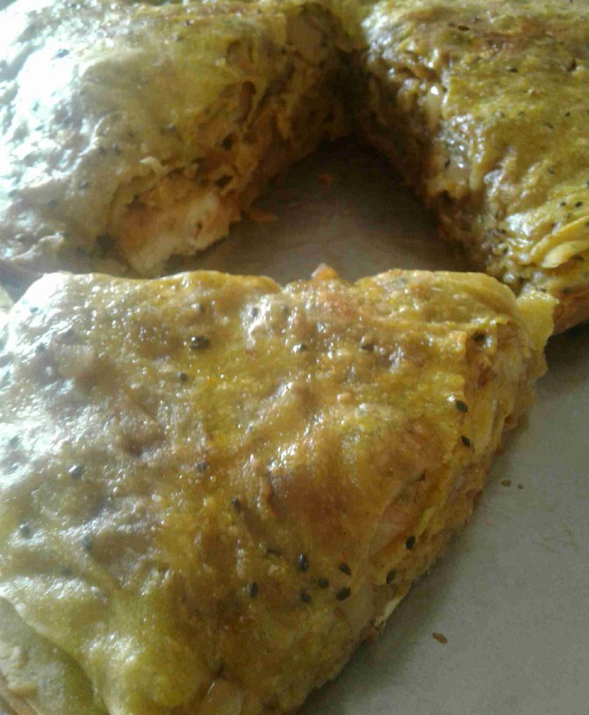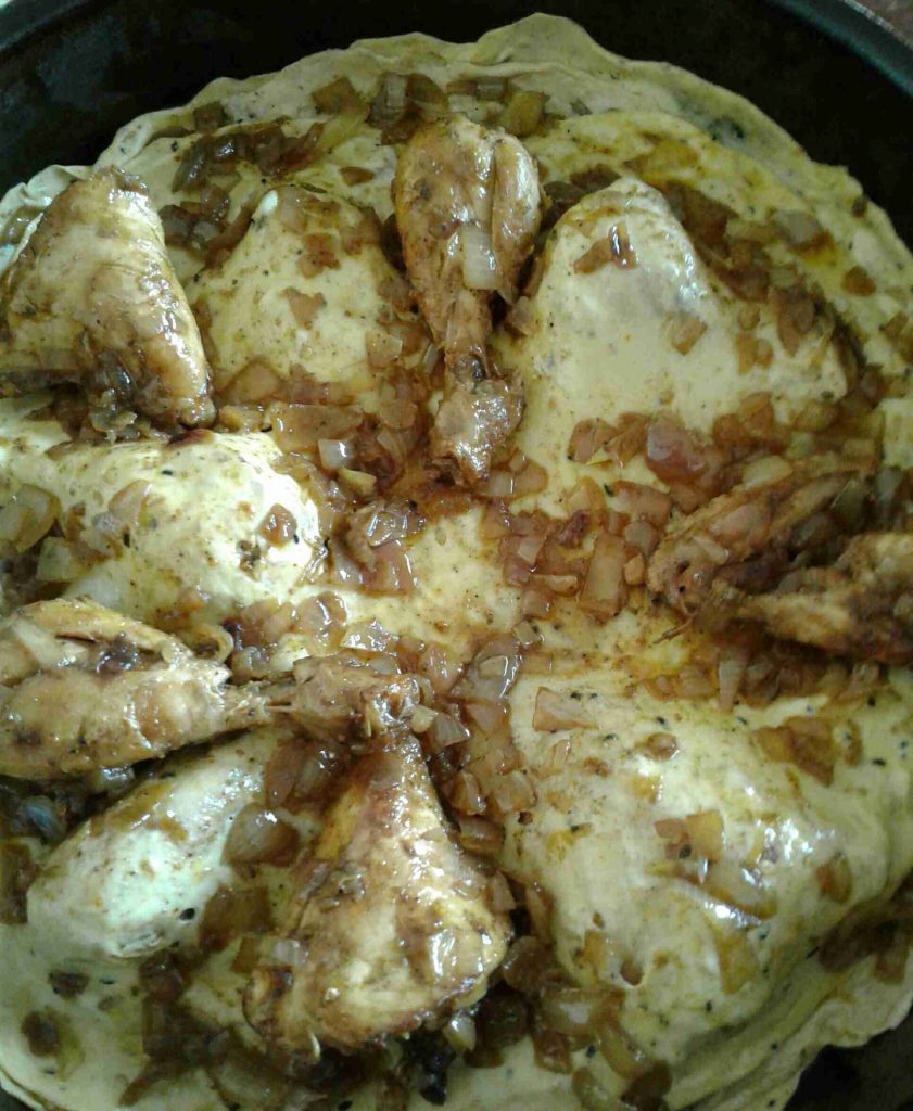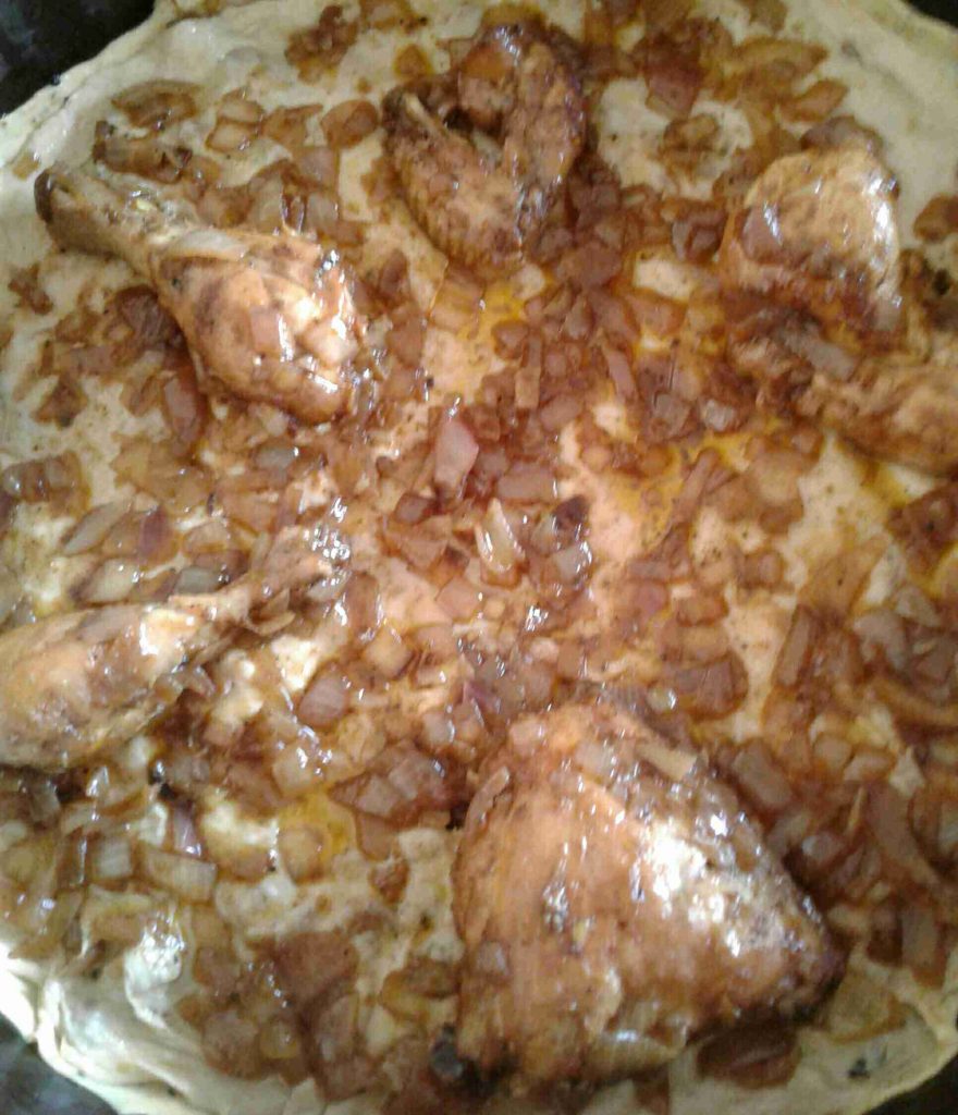 – على طاولة العمل.. نبدأ بفرد أول كرة من العجين باستخدام الزيت الذي تمت تصفيته (مع مراعاة ترقيقها قدر المستطاع) ونضعها في صينية الخبز بعد دهنها بالزيت ، ونضع فوقها القليل من البصل وأربع أو خمس قطع من الدجاج متباعدة عن بعضها .