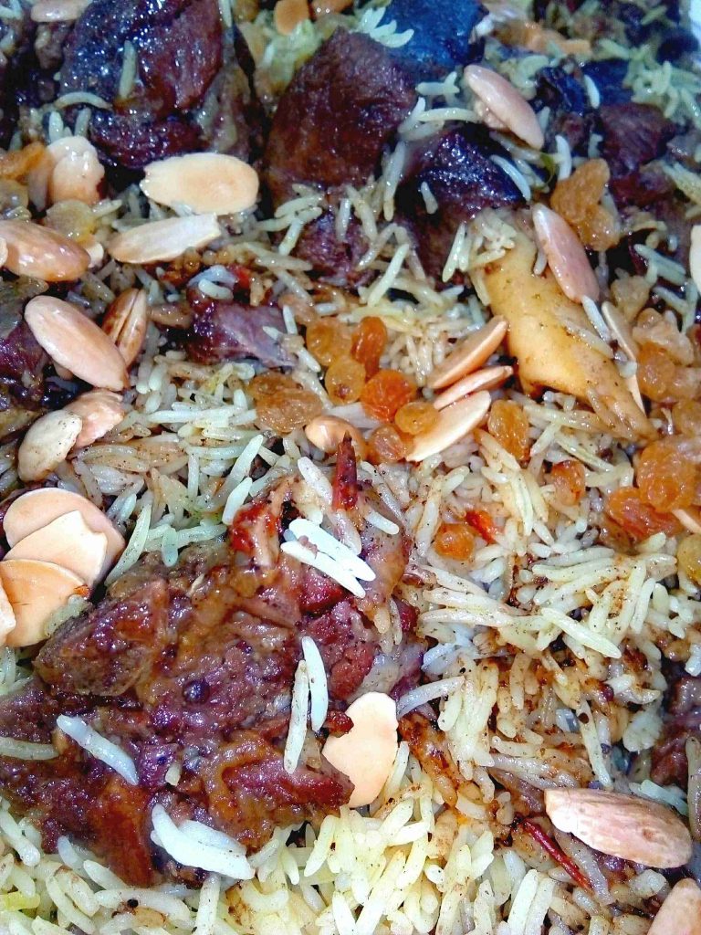 طبعا الارز البسمتي منقوع ومغسول بنضيفه لطنجرة الضغط فوق اللحمة وما بنقلبهم ببعض لا بدنا تضل التتبيلة واللحمة من تحت وبنشوف مقدار المي اذا مناسب للرز او بنزيد شوية مي المهم كمية المي تكون مش مرتفعه عن الارز بتكون مبينه من الارز ومش غامريته بنغطي الطنجرة مزبوط وبنستنى تصفر ، بس تصفر بنوطي الغاز عالااااخر وبتعايري ربع ساعة وبتطفي الغاز وبتتركيها ترتاح قبل التقديم عشر دقايق.