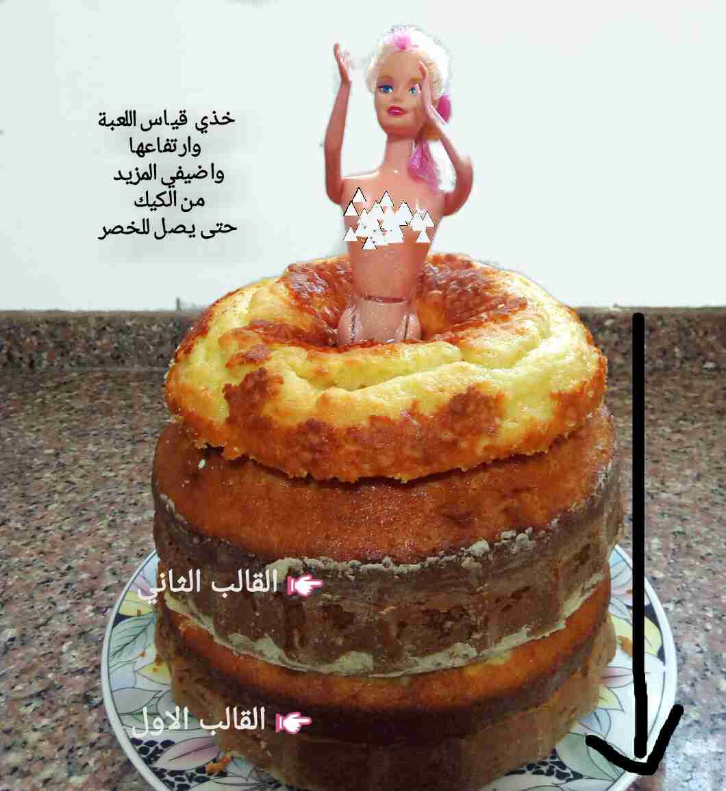رتبي القالبين فوق بعض وثبتيهم بأعواد خشب قوية الخاصة بالشواء احسن شيء واحشي بينهم كريمة زبدة عشان يلزقوا ودخلي اللعبه بالوسط وقيسي عليها لازم الكيك يوصل للخصر واذا طلع اقل من الخصر زيدي من الكيك اللي قطعتيه .