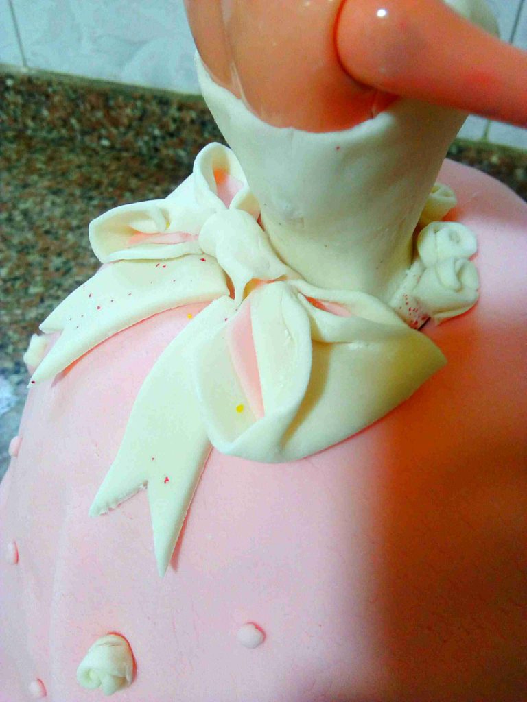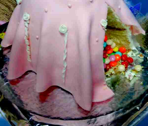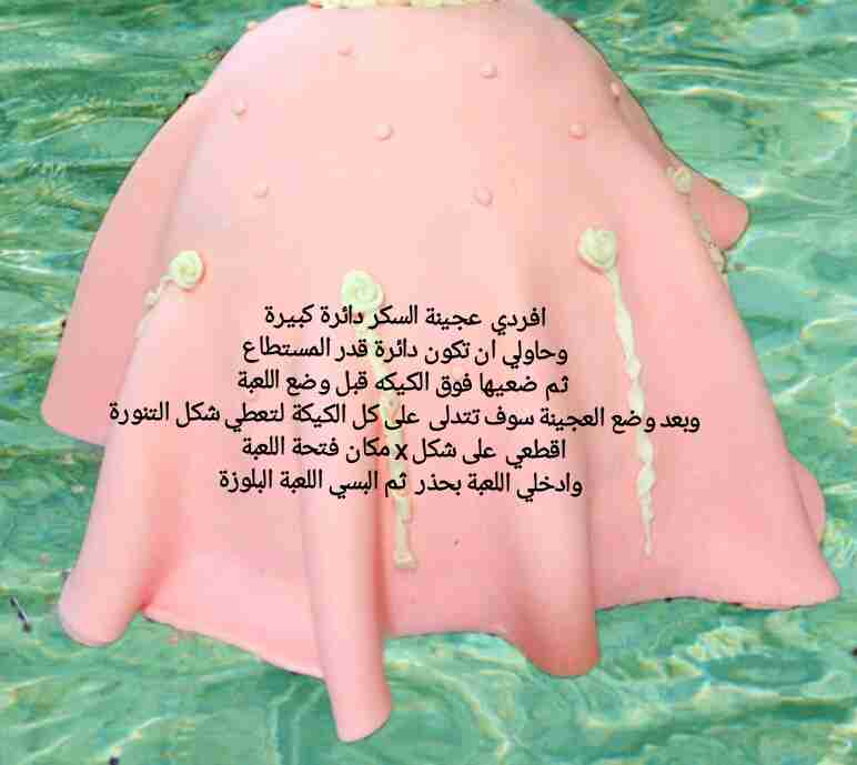 افردي قطعة عجينة السكر الزهر الكبيرة افرديها بشكل دائري واسع ولا تبخلي بكمية العجينة بلاش يطلع الفستان قصير، وشيلي الدائرة المفرودة بحذر وحطيها فوق جسم الكيك وخليها تنزل رح تصير ثنيات مثل الفستان الحقيقي وزبطيها انتي ورتبي ثنياتها .