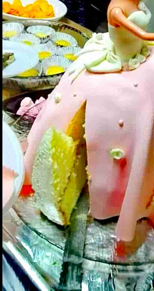 بعد ما صار القياس تمام بلشي انحتي الكيك على شكل تنورة الفستان بسكين منشارية وبهدوء مابدها كثير نحت شكل قوالب الكيك بيساعدك لانهم انسيابيين.