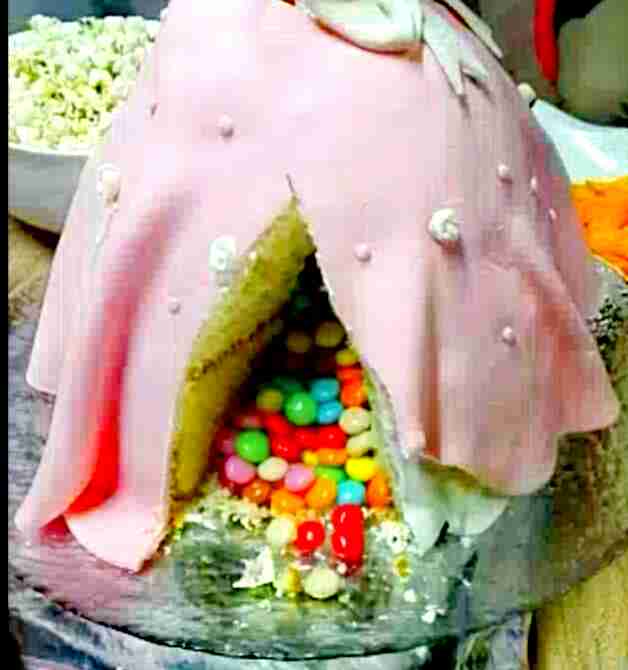 / افتحي بالسكين من فوق عند فتحة السكاكر افتحي على شكل x ودخلي اللعبة بلطف وانتبهي انه فيه سكاكر ، نزلي اللعبه لخصرها.