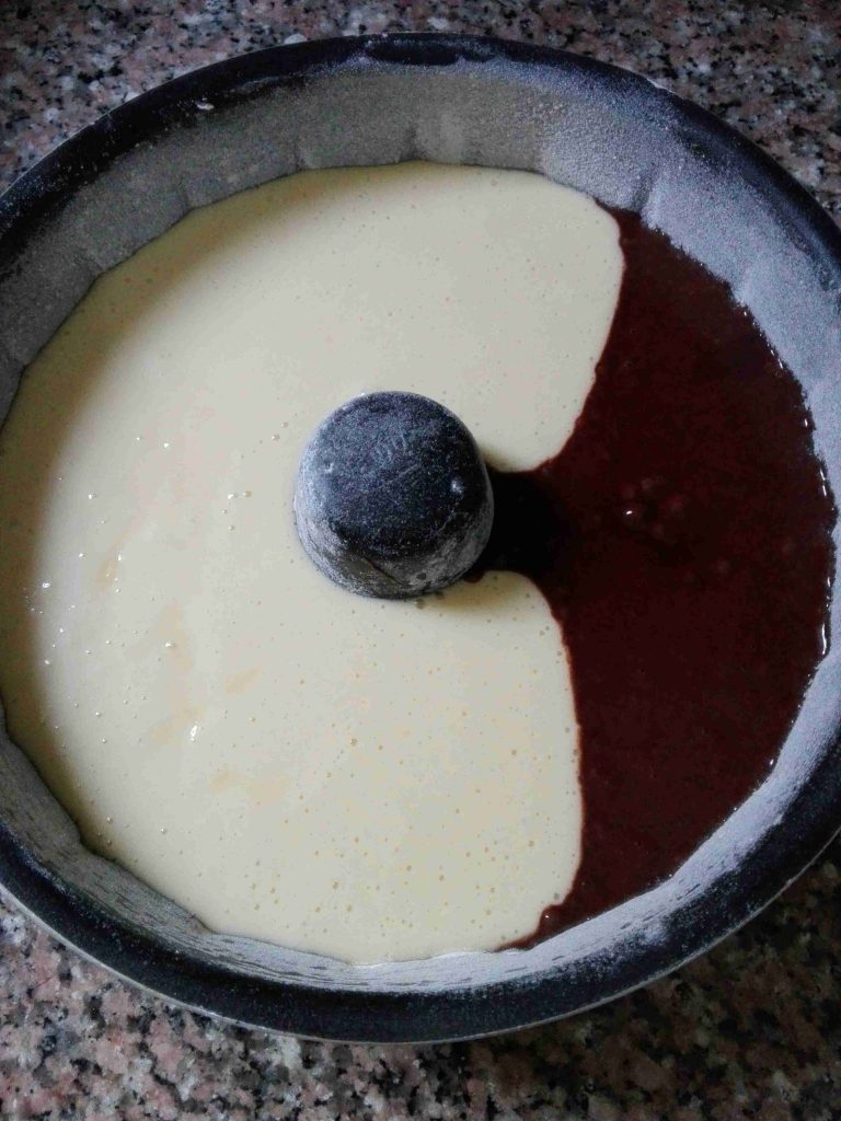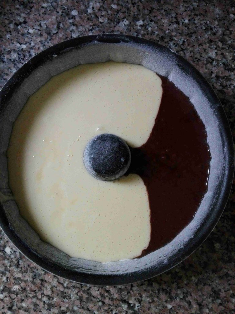& بجهز القالب بدهنه زيت وارشه بالطحين …وببلش اضيفله من خليط الكيك من القسمين سوااا كل قسم بأيد لحتى يخلص عندي الخليط ..