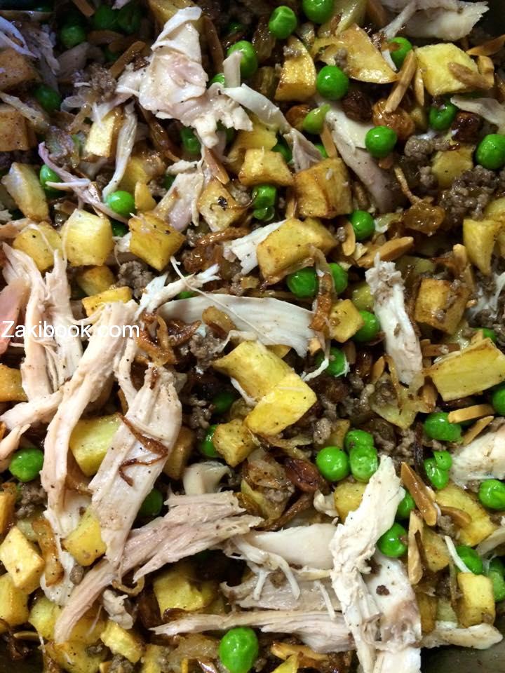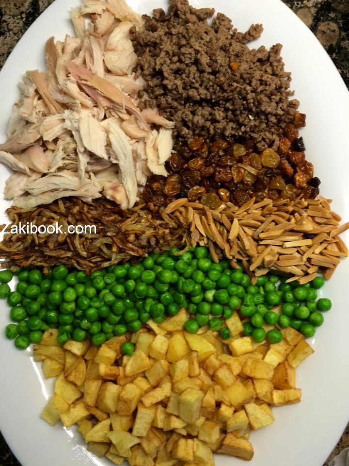 حبتين بطاطا مقشرة ومقطعة مكعبات صغار، حبة بصل كبيرة مقطعة جوانح ، كوب لحم مفروم ، كوب دجاج مسلوق ومنظف ومقطع الى قطع صغيرة ، نصف كوب بزاليا ، نصف كوب لوز مسلوق ومقشر ، ربع كوب زبيب
