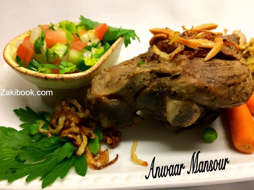 تخلط مواد التتبيلة مع بعضها ويلوث اللحم بهم ويوضع ويترك في البراد لثاني يوم . يوضع في صينية فرن ويقطع بصل شرائح معه مع ورق غار وبهارات صحيحة مثل الهيل والقرنفل وبهار حلو ( كبابة ) يوضع في فرن على درجة حرارة ٤٠٠ لمدة ثلث ساعة ومكشوف بعدها يغلف بورق قصدير جيداً وتخفض الحرارة الى ٣٥٠ ويترك اقل شي ساعتين حسب نوع اللحم الى ان ينضج ترفعين الغطاء وتسقيه من مائه وتتركيه لدقايق الى ان يحمر ويقدم مع رز برياني او برغل او اي شي ترغبيه.