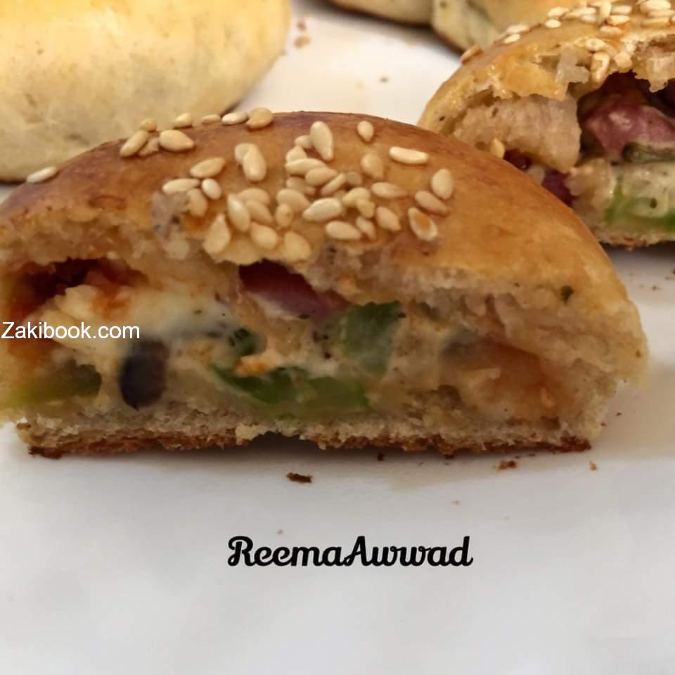 نخلط النقانق والفلفل والزيتون والفطر ونرش الريحان .ثم تفرد قطعة من العجينة وتدهني بالقليل من الكاتشب وتضاف الحشوة ويتم إغلاق العجينة على شكل كرة وتصف في الصنية هكذا حتى انتهاء الكمية وتدهن بالقليل من البيض المخفوق مع القليل من الخل ونرش الوجه بالسمسم وخبزناهم في فرن محمى مسبقا