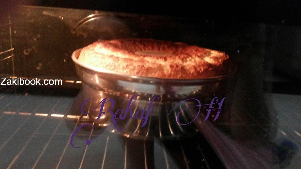3 بيضات كبيرة بالخلاط وكاسة ونصف سكر وملعقة صغيرة فانيليا نخلطهم بالخلاط حتى يذوب السكر نضع فوق المزيج كاسة حليب ونصف كاسة زيت نخلطهم مع بعض نضع المزيج في زبدية (وعاء) ونخلطهم مع كاستين طحين ملعقة كبيرة باكمبودر وبرش برتقالة او ليمونة ونضعه بالفرن على درجة حرارة 180 لمدة ساعة إلا ربع والف صحة وهنا.