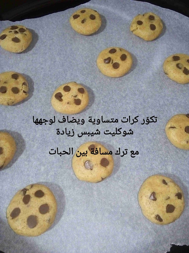 بنطلع الخليط من الثلاجة وبنعمل كرات متساوية بحجم اكبر من حبة الجوز بشوي وبنرجع بنرص شوية من الشوكليت شيبس على وجههم عشان يبينوا وبنرتبهم على صينية فيها ورق زبدة او مدهونة عالخفيف بزيت وبنراعي يكونوا متباعدات عن بعض لانهم بيفرشوا بالفرن.