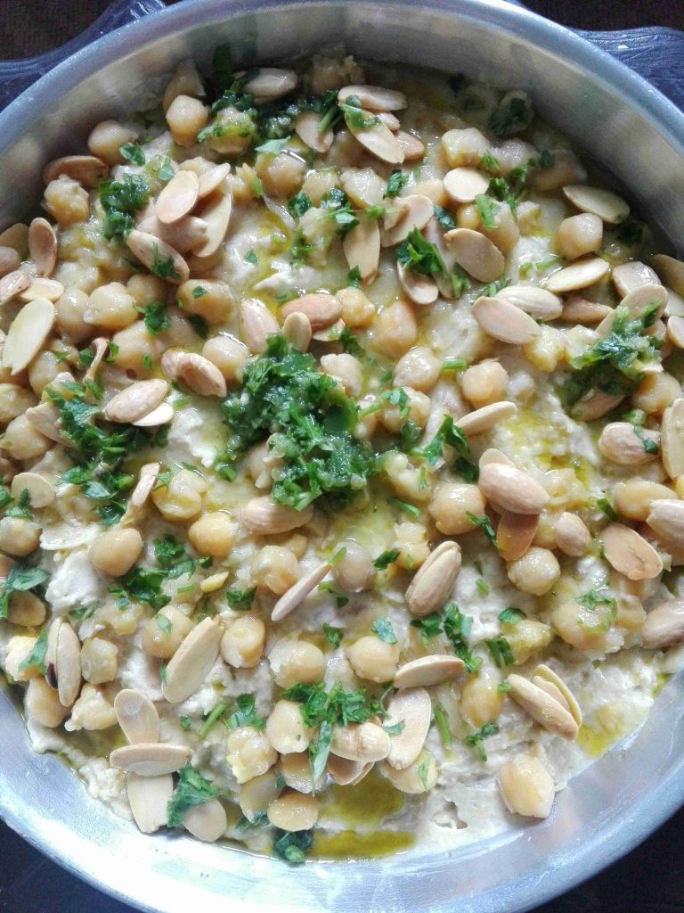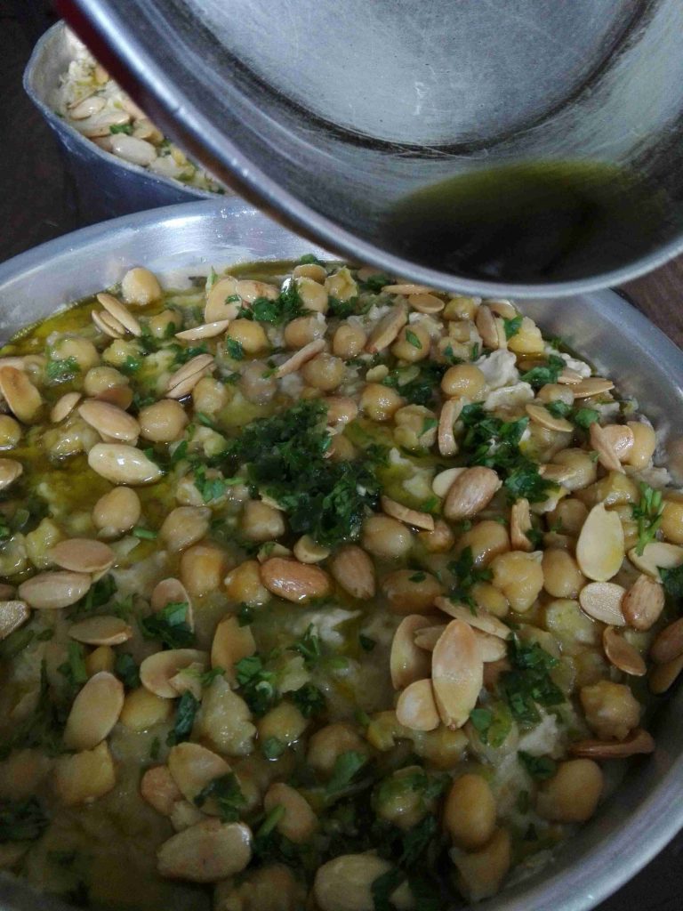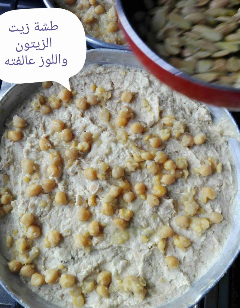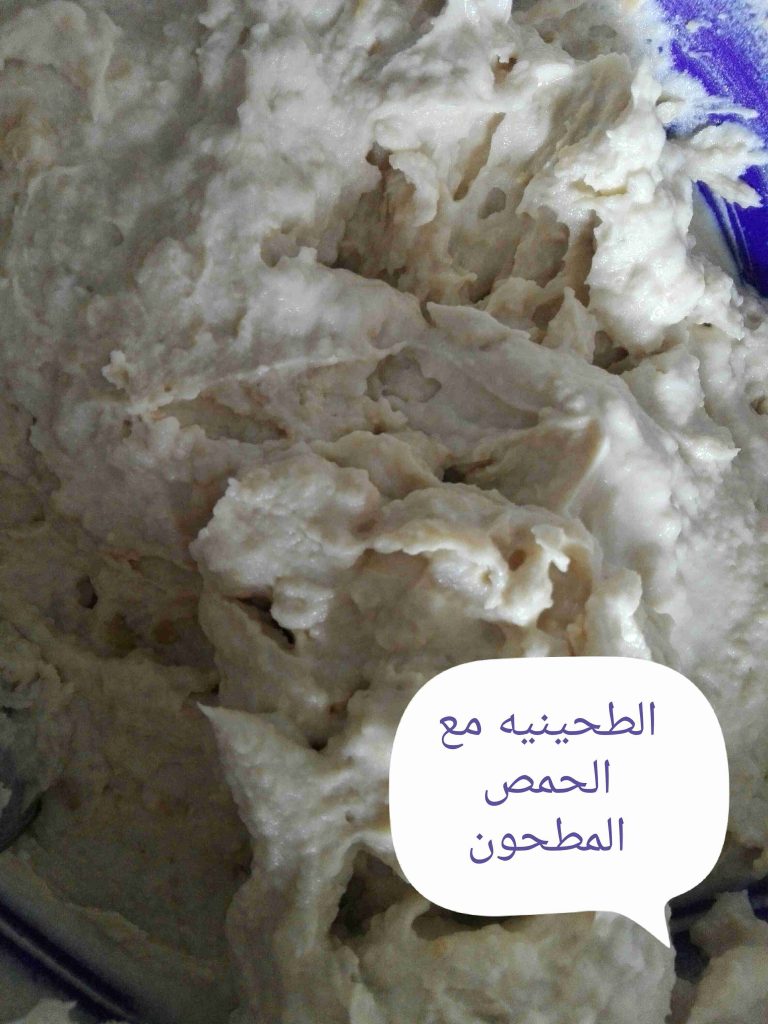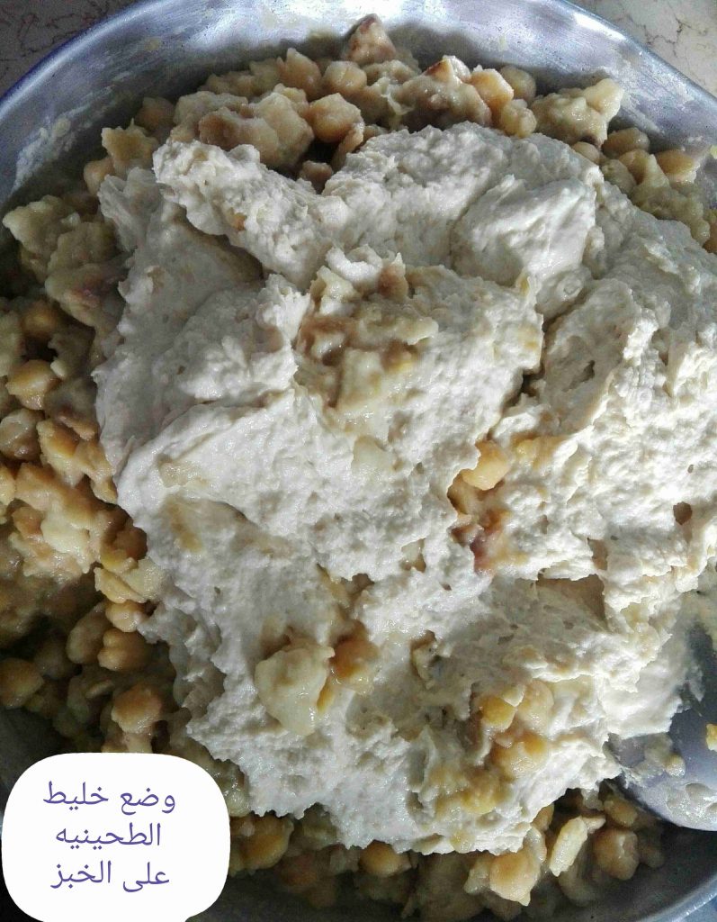 وبضيف الطحينيه والحمص المطحون عليه وبحركهم مزبوط وبفردهم بالصينيه يلي راح اقدم فيها …