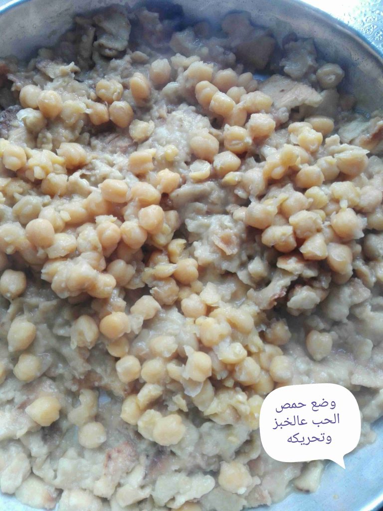 & ومن بعد هيك ..باخذ من الحمص كمية وبطحنهم وبضيفهم عالخليط الطحينيه وبحركهم ..ومن ثم بضيف حمص حب من غير ما اطحنه عالخبز وبحركهم سوا