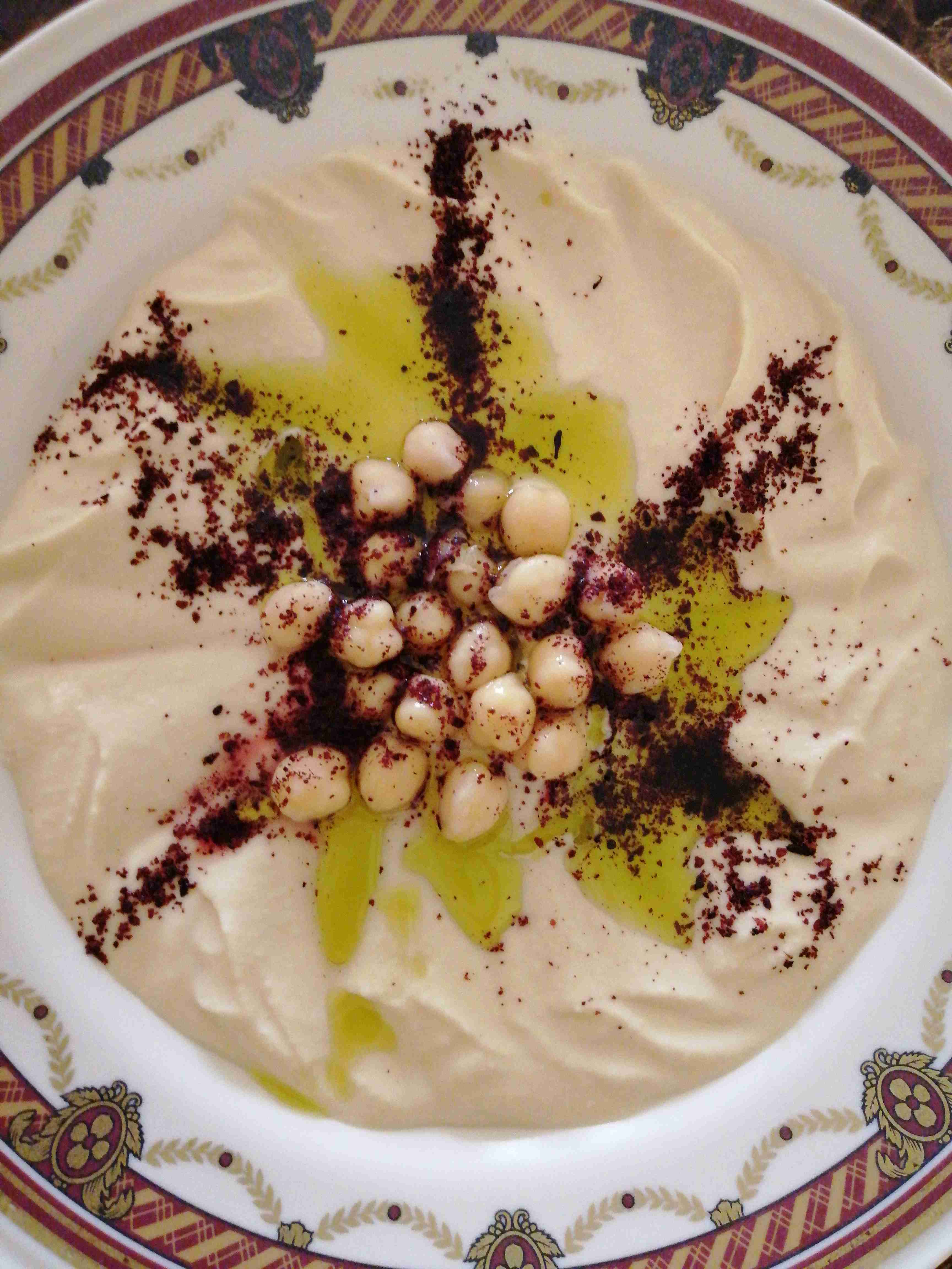 الطريقه في ابريق الخلاط الكهربائي نضع الحمص وجميع المقادير مع بعض ويخلطو جيدا مده دقائق تسكب في طبق التقديم وتزين بالحمص الحب ورشه من السماق وزيت الزيتون تقدم مع المقبلات والمشاوي