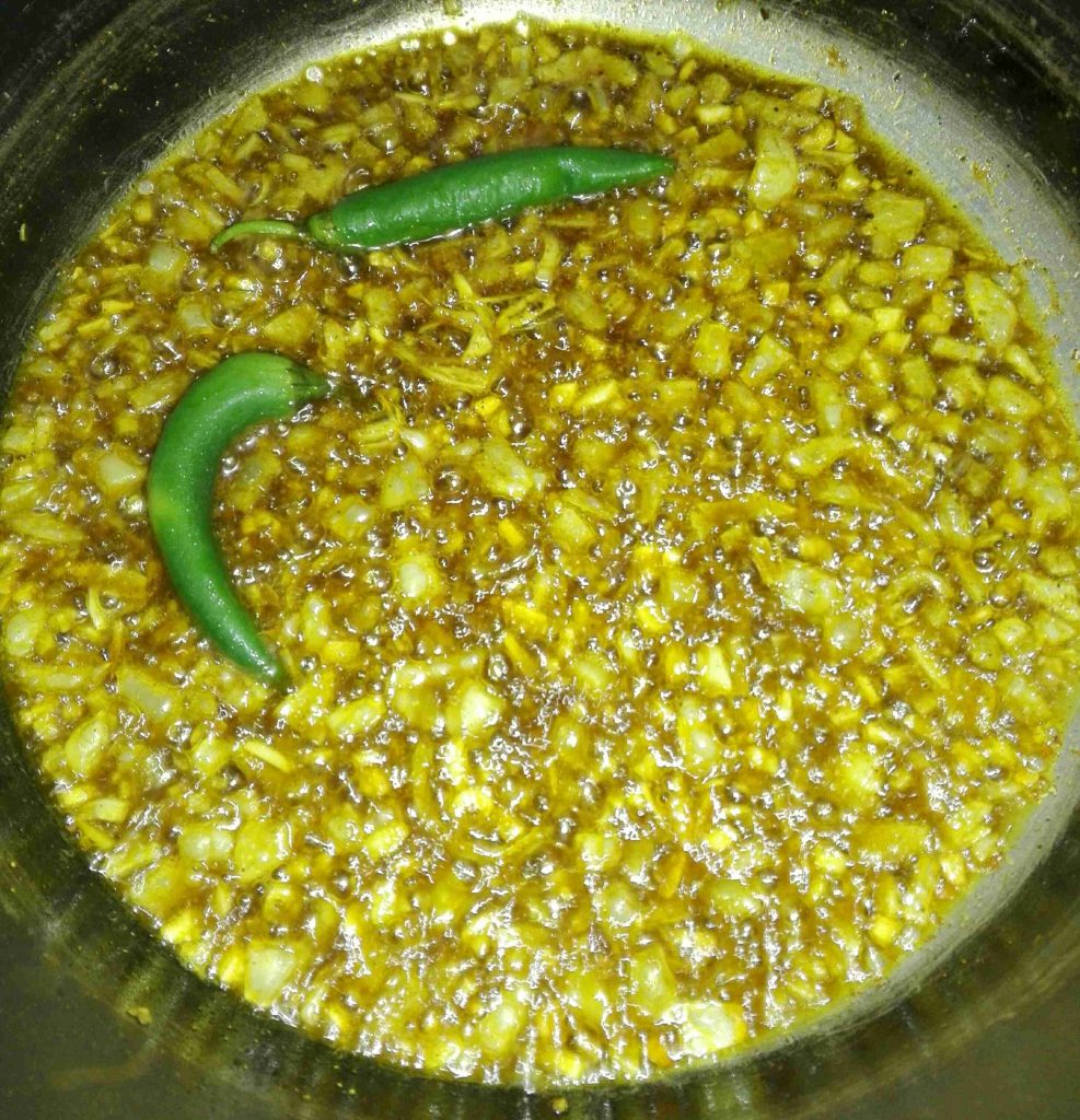 & أول شي بنقلي البصل بزيت ذره بزود الزيت شوي عشان الارز وثم بضع الثوم المفروم او المهروس ..وبضيف البهارات جميعها لحتى تتقلى بالزيت ..وبضيف بعد هيك الفلفل الحار وبقليهم سواا