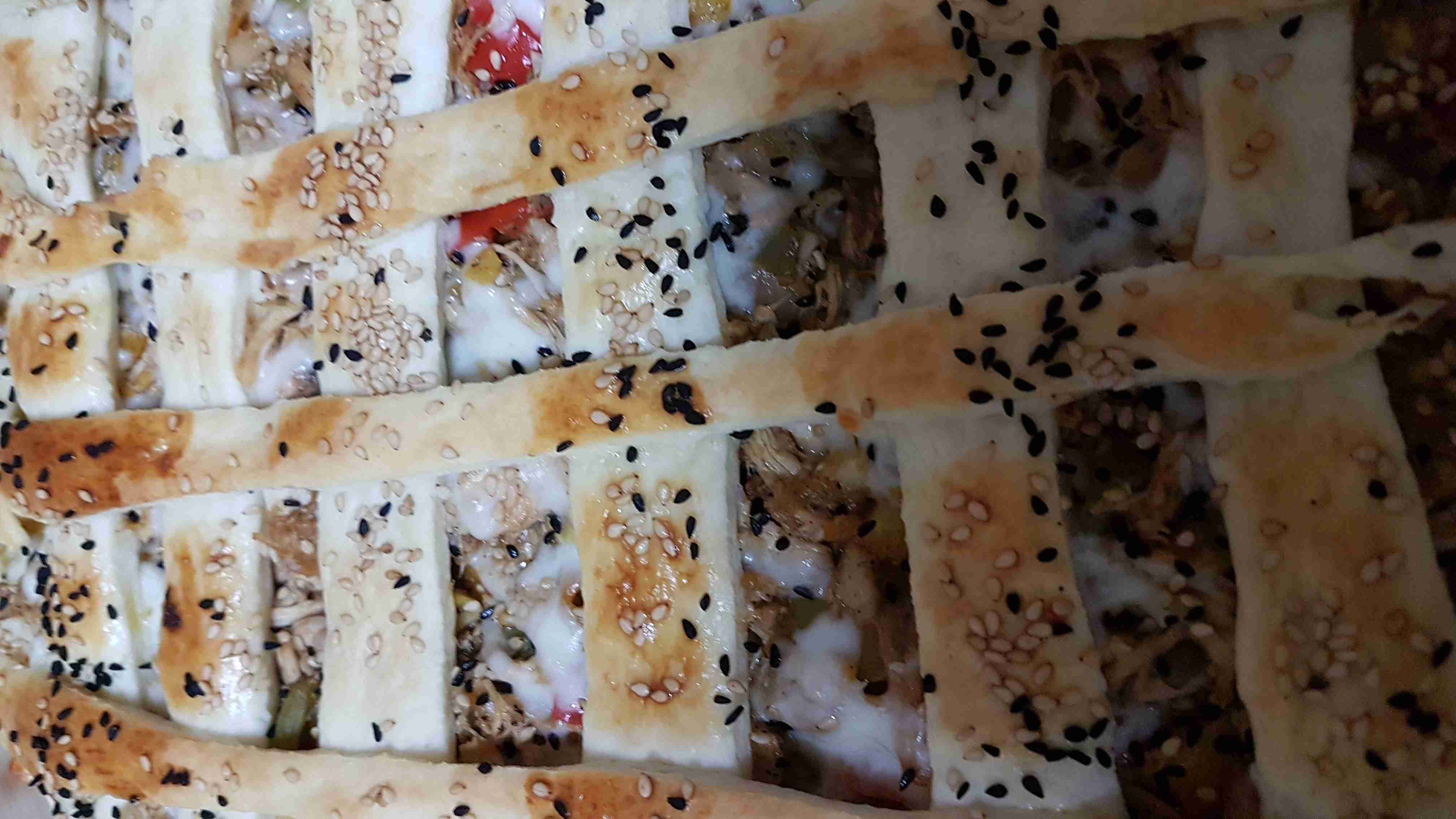 نُغلق العجينة على الحشوة بشكلٍ منتظم ومتناسق، ونجهز صينية الفرن بوضع القليل من الزيت عليها، وبعها نضع الفطيرة التركية فيها.