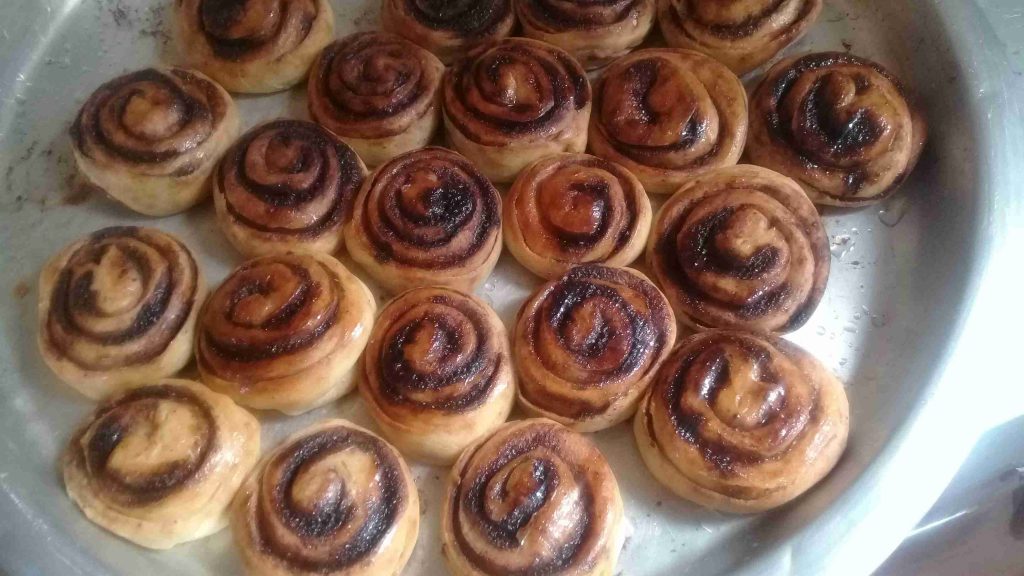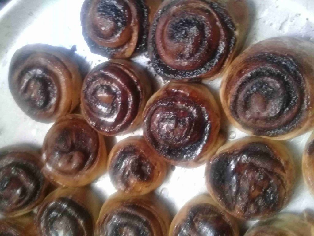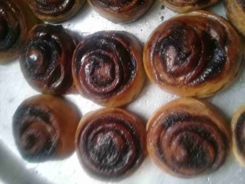 اول شي البيضه بنخفقها مع فانيلا وسكر و الخل والحليب وبعدها بجيب الطحين الخميرة والملح والبكنج باودر بضيفهن وبحرك منيح بعدها بعجن شوي شوي بلمي الفاترة بعجنها منيح لما تكون عجينه طريقه وجامدة بجيب نص كاسه زيت بحطها فوق العجينه وبرجع اعجنها لما فوت زيت بلعجينه بتركها تخمر وترتاح ساعه بعد ساعه بقطعها وبفرد العجينه على شكل رغيف كبير بدهن الرغيف بزبدة طريه وبرشها كاكاو القرفه وسكر بلفها رول وبقطعها بسكينه دوائر بريحها قبل الخبز ربع ساعه وبعدها بخبزها على فرن درجة الحرارة ٢٠٠ بس تتحمر من تحت بحمرها من فوق بعد ما خرجها من الفرن بسقيها قطر تقيل وبارد