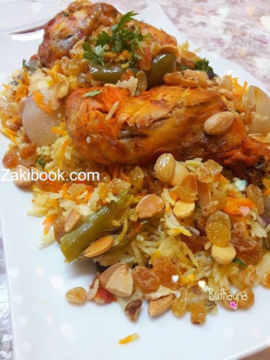 – وبس يستوي الرز والجاج بنكشف القصدير وبنحمر الجاج وبنحط زعفران مع شوية مية او بودرة زعفران او حتى كركم او ملون طعام بنعمل خطوط عالرز بدون ما نحركو.