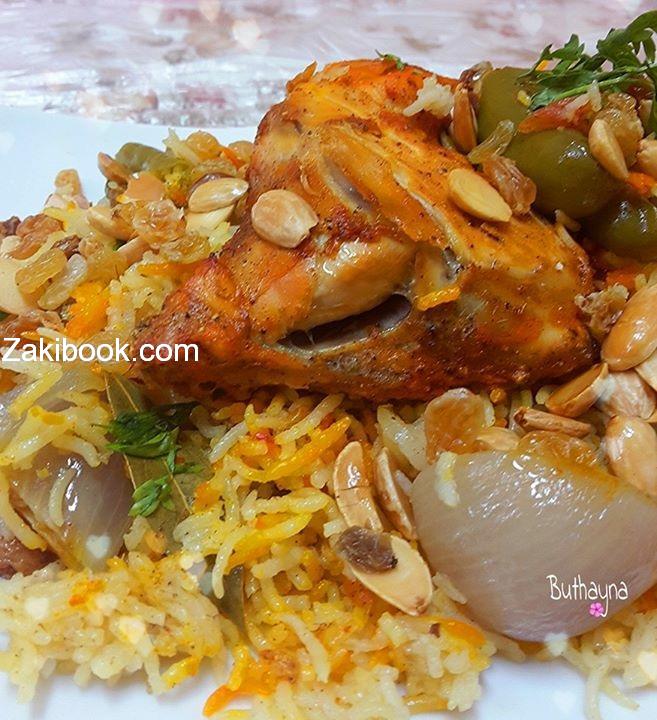 – وبنحط فوق الرز شبك وعليه الجاج واذا ما في شبك بنحط طبقتين قصدير بنخزقهم وبنحط عليهم الجاج وبنلف قصدير حوالين الجاج والصينية وبندخلها فرن محمينو قبل بوقت وبندخل الرز والجاج تقريبا ساعة ونص.