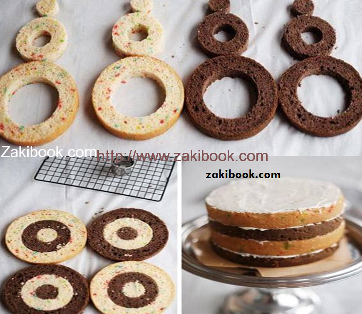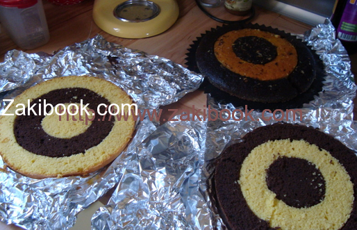بعدين اخدت القطع اللي بالنص الدائرة الوسط وبدلتها بين الاسود والابيض يعني اخدت الدائرة السودة اللي بالوسط حطيتها مكان البيضة والبيضة اللي بالوسط مكان السودة, ونفس الشي بالقالبين التانيين,لكن قبل ما ابدل بين القطع كنت أدهن حرافهم كريما حتى يلصقو.