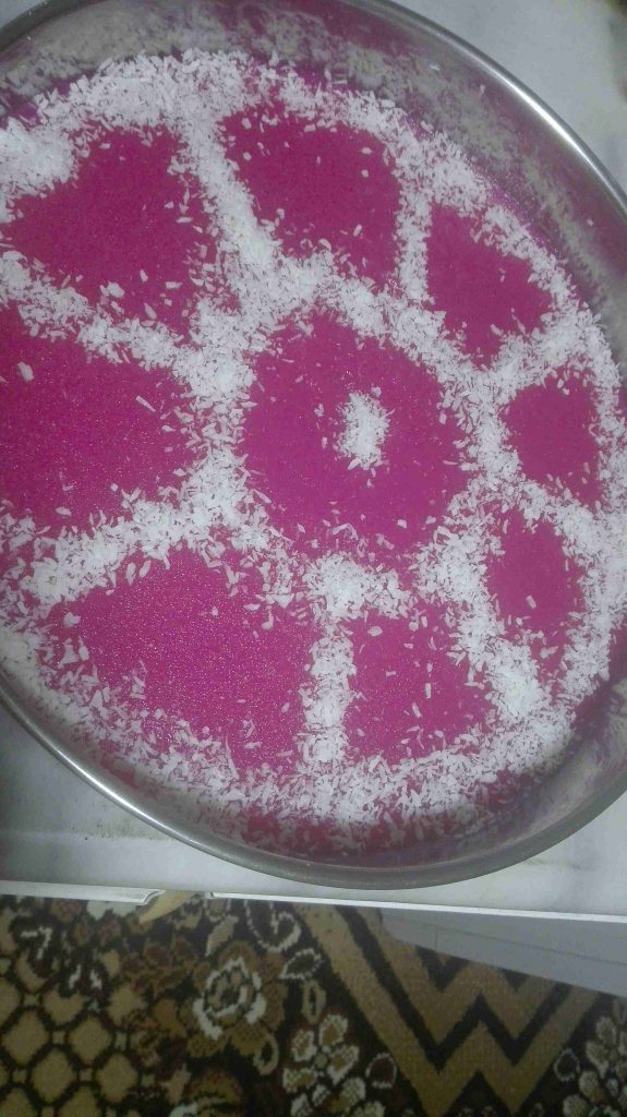اول شي يا صبايا حطيت طنجرة وسط على الغاز سحنت المي وحطيت الصبغة بطرف المعلقة والسكر حطيت لحد ما دقت انها صارت حلوة المي بزيادة لانو السميد بخفف الحلاوة بعدها صرت انزل السميد شوي شوي مع التحريك المستمر طبعا لحتى ما تكتل وبضلك اتزيدي سميد لحتى تشوفي انها صارت تثخن شوي شوي بتشيليها عن الغاز وبتضيفي عليها ماء الزهر تقريبا ملات الغطا بس وبتحركيها منيح وبتسكبيها بالسدر وبتزينيها بجوز الهند وبتتركيها تبرد وبتقدميها
