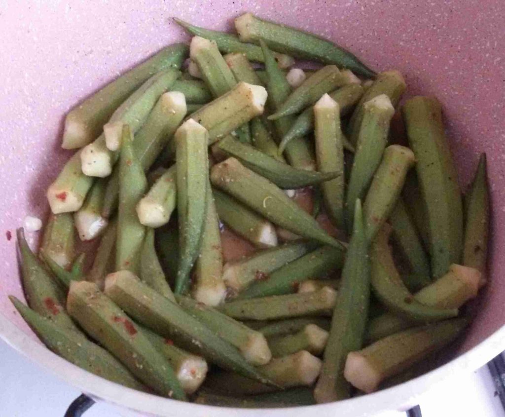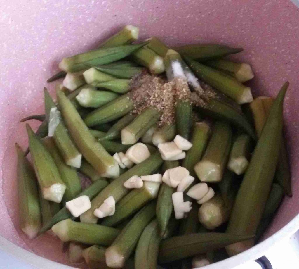 منحط الزيت والبامية بطنجرة عالغاز ومنستنى شوياية بس ليدبلو منضيف عصير الليمون لحتى ماتلزق البامية بسبب المادة الشطاطة اللي فيها ههههه وبعدو منضيف البهارات والتوم