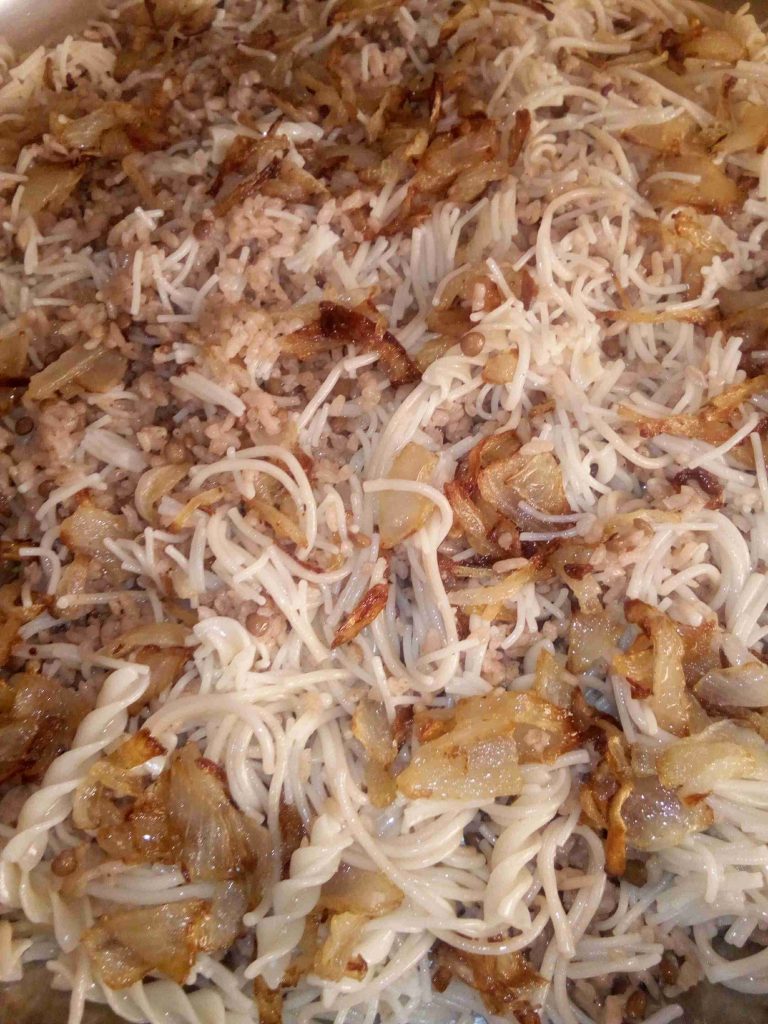 ننقع الرز ونسلق العدس ونطبخهم معا مع زيت ومي