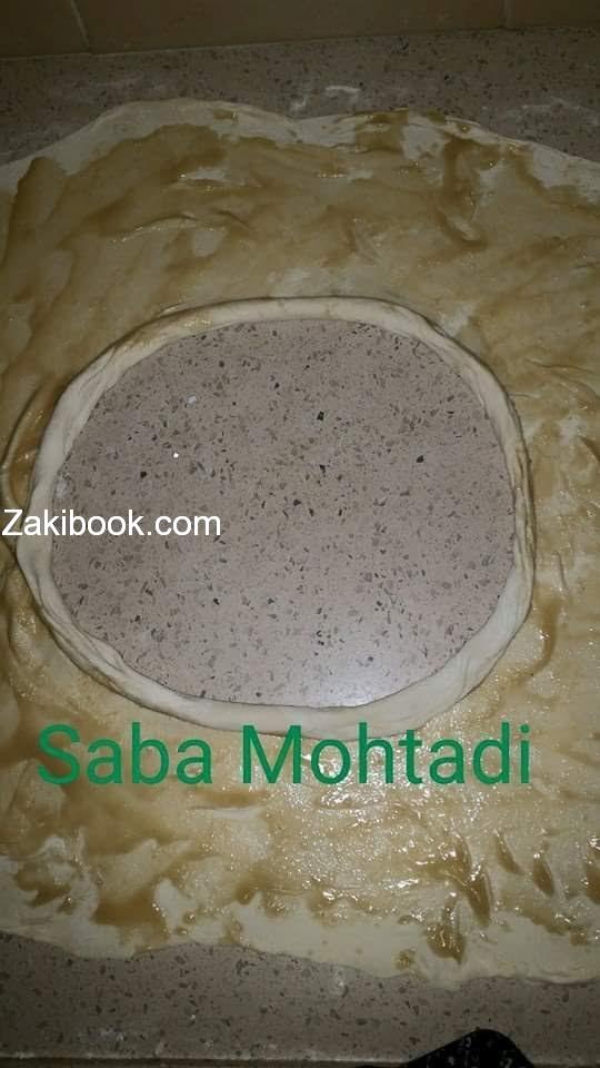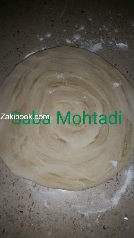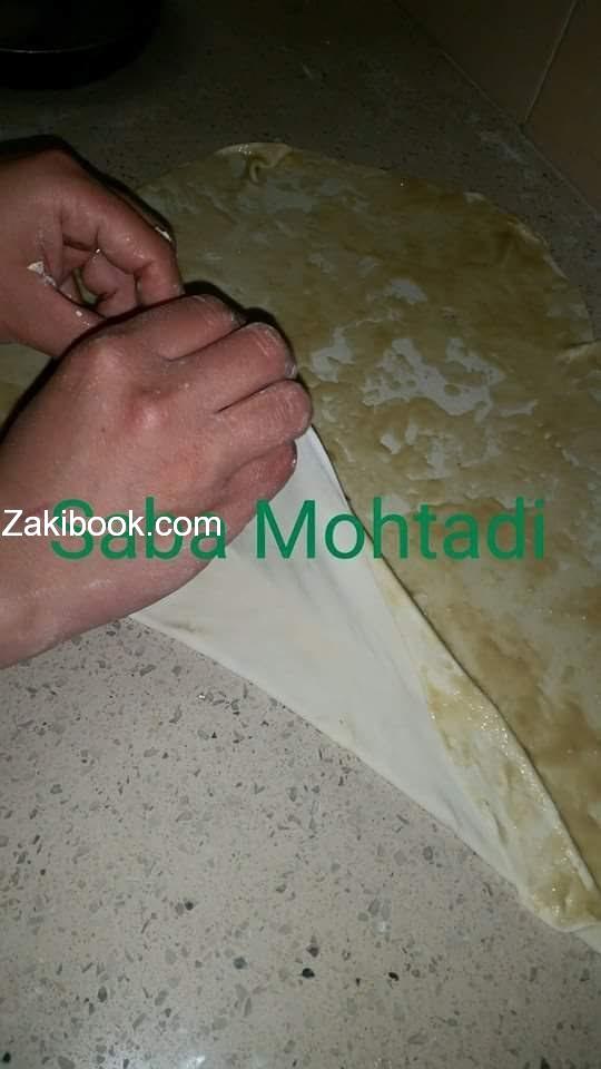 ندهن خليط الحشوة بفرشاة او نرش من خليط الحشوة على شكل خيوط ونقاط ونثني العجينة ونرجع نفردها وهكذا ( كما في الصورة ) حتى نوزع خليط الحشوة والمبدأ هنا انه سيلتصق بالجزء المثني ثم نفرده ونثني جزء آخر وهكذا – ونضع من الحشوة المقدار المرغوب