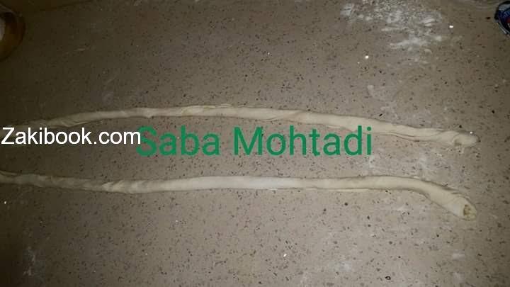 بعدها نصنع ثقبا بالمنتصف ونبدأ بلف العجينة وبرمها ( كما في الصور )