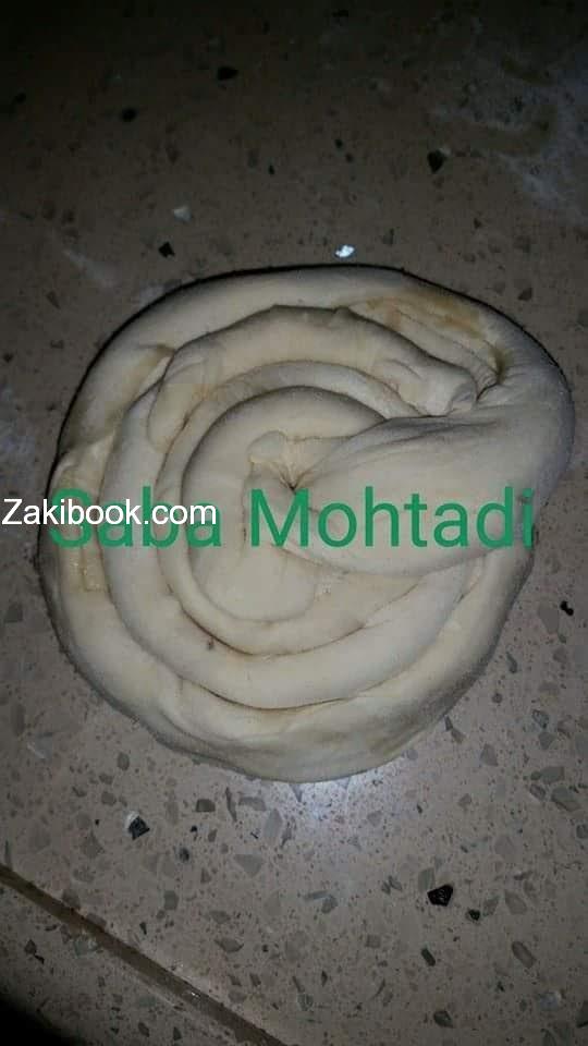 ونكمل بقية العجينة وبعد الانتهاء نرق الدوائر الحلزونية