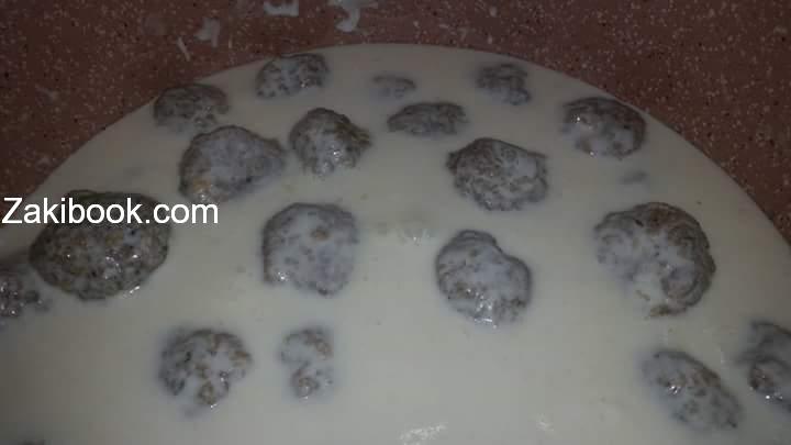 بعدها نضيفهم للبن الساخن ( تقريبا كيلو لبن رايب مضاف له مقدار من الماء وملعقة نشا وملح … لكن للامانة انا خلطت بين الجبجب واللبن الرايب ….يطبخ عالنار مع التحريك …. بعد الغليان نضيف كرات اللحم ونتركهم يكملوا النضج مع اللبن